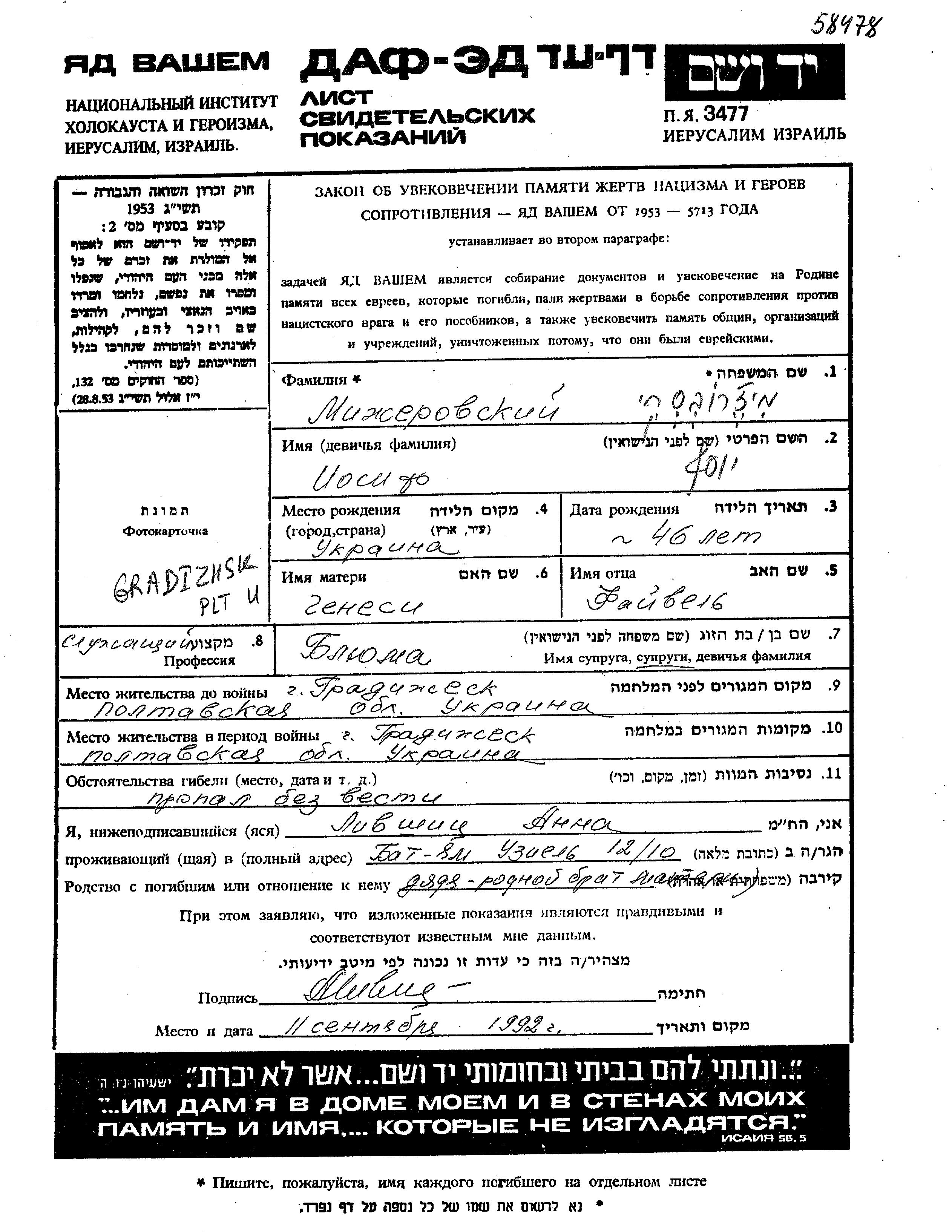Mizherovski Iosif Gradizhsk, Ukraine (URSS) Feuille de témoignage
