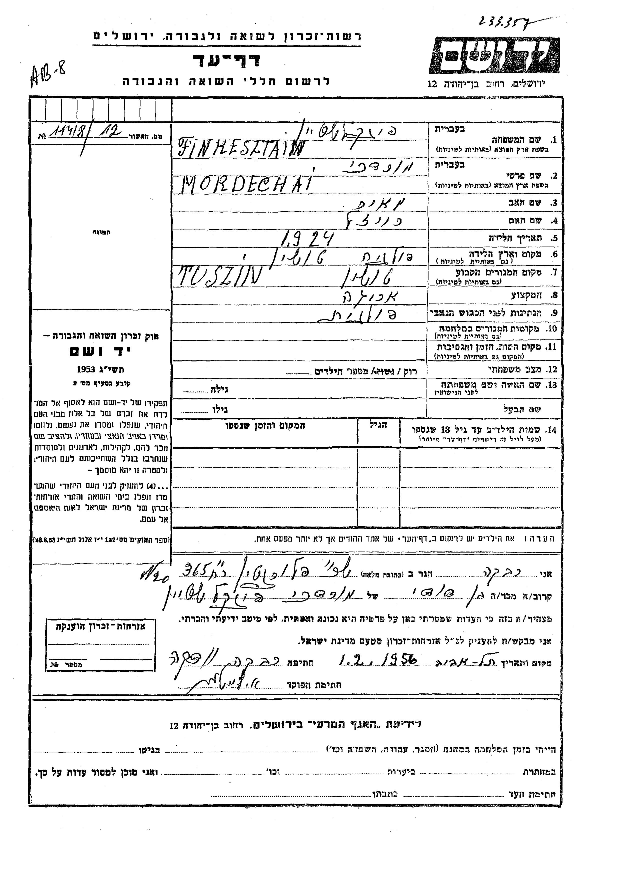 Finkesztain Finkelshtein Mordechai 1924 Tuszyn, Pologne Feuille de témoignage