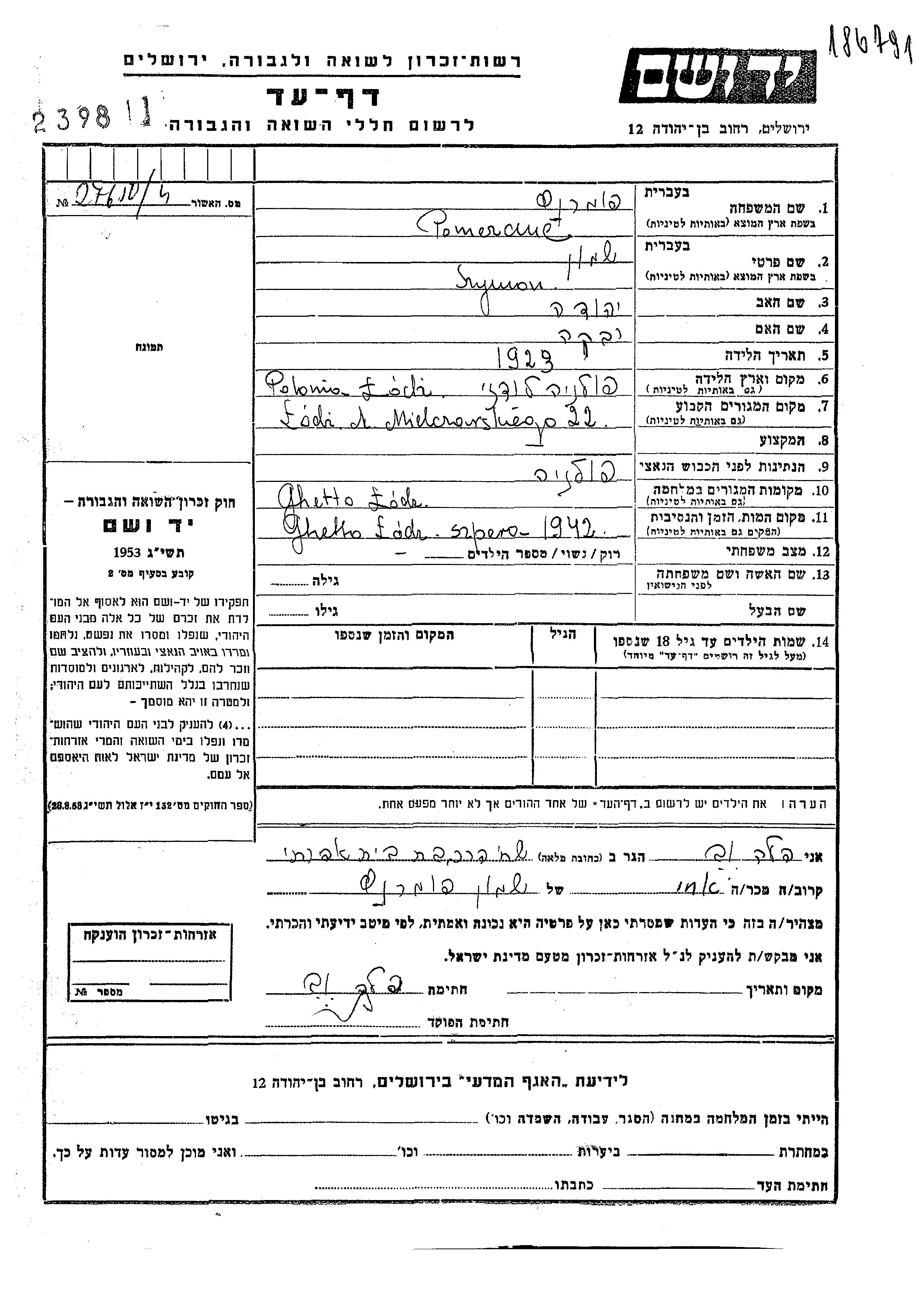 | Pomeranc | Symon | Lodz, Pologne | Feuille de témoignage |