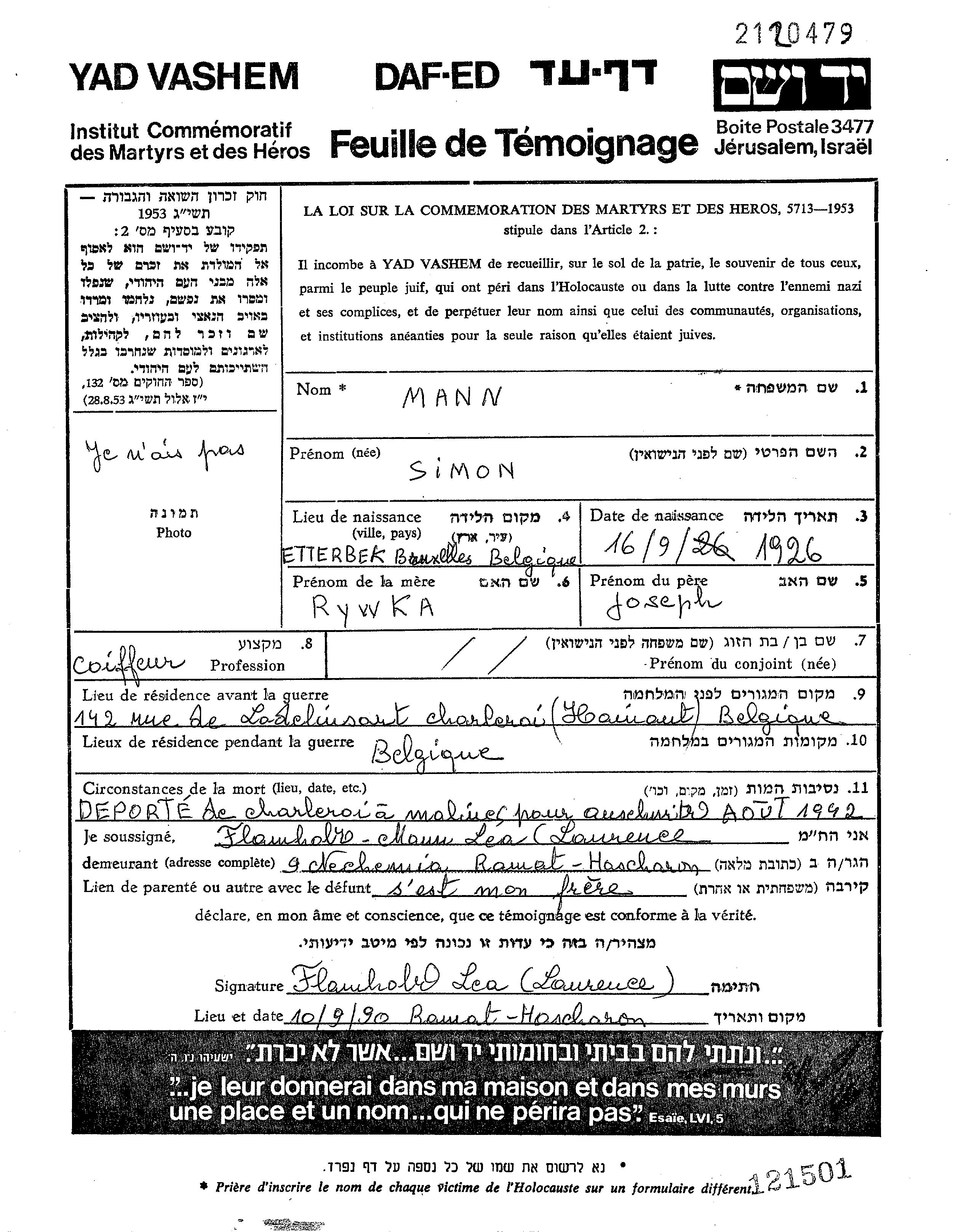 Mann Simon 1926 Charleroi, Belgique Feuille de témoignage