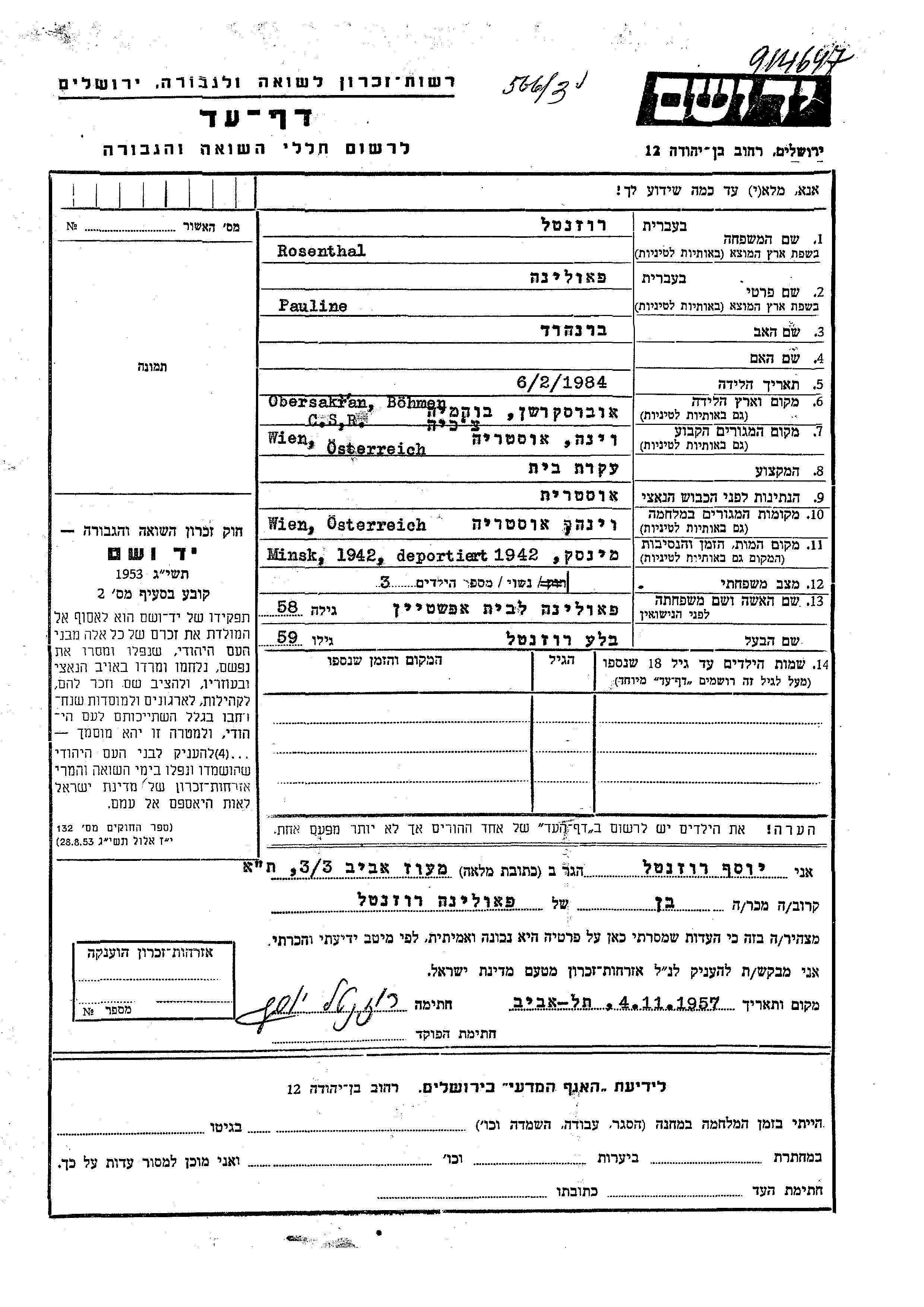 Pauline Rosenthal née Epshtein est née à Obersekeran, Tchécoslovaquie en 1884. Elle était Femme au foyer. Avant la seconde guerre mondiale elle vivait à Wien, Autriche. Pauline a été assassinée pendant la Shoah. Lieu de la mort: Minsk, Bélorussie (URSS) en 1942.