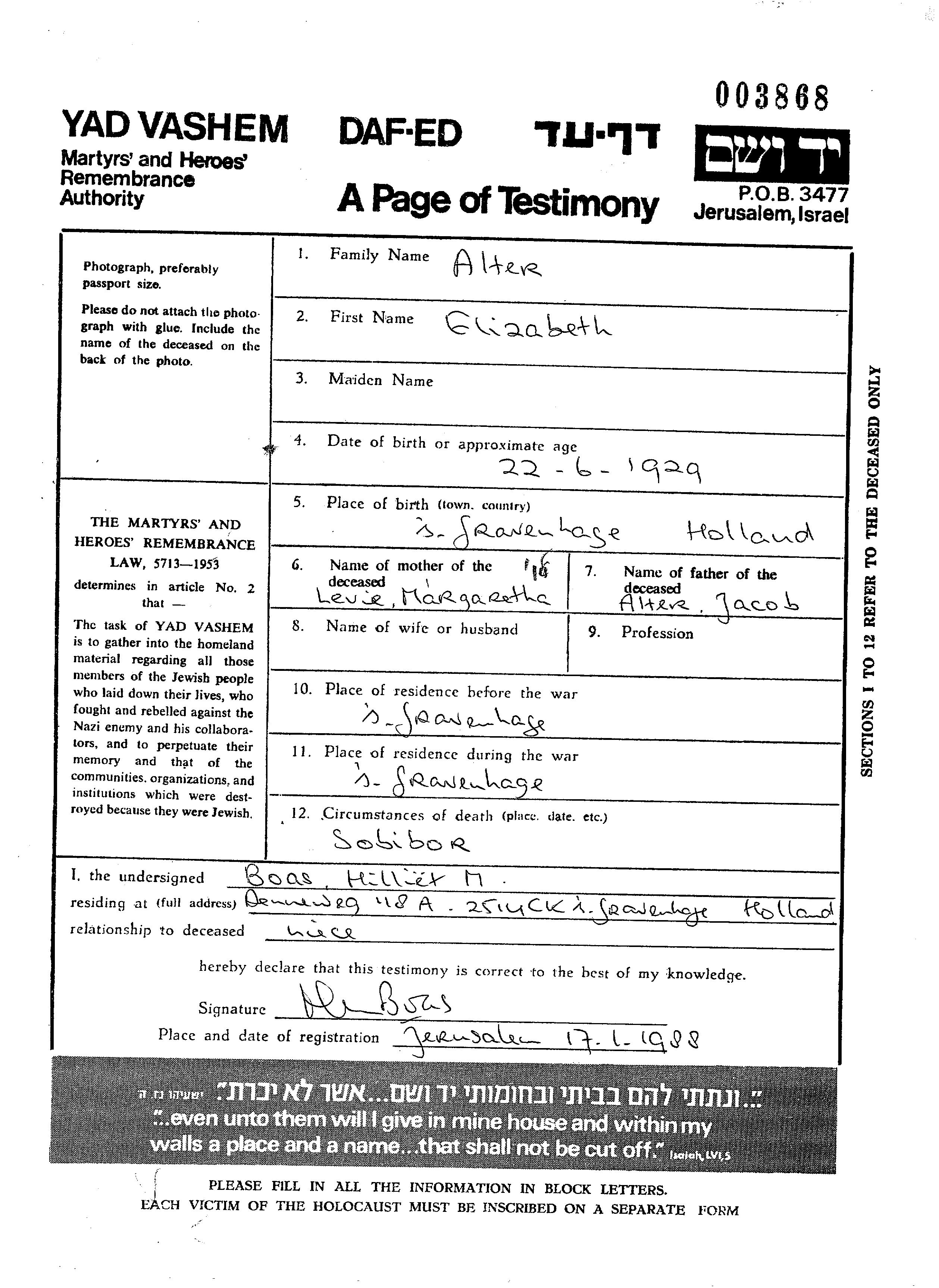 Recherche par nom du dépositeur de la Feuille de témoignage. Cette recherché indique aussi les noms de jeunes filles.