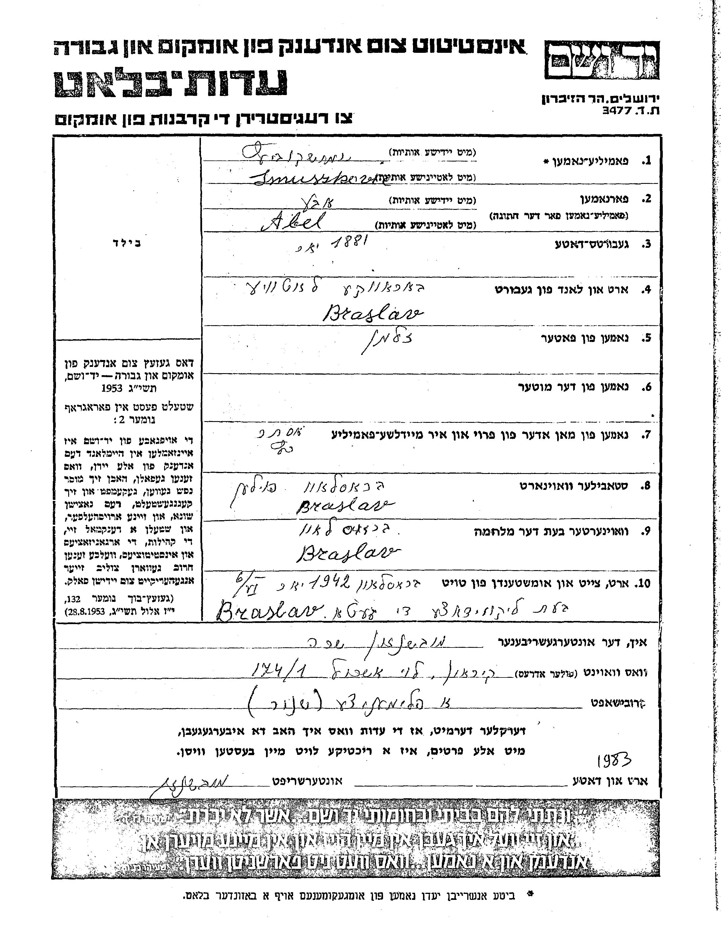 Smuszkovic Abel Aba 1881 Braslaw, Pologne Feuille de témoignage