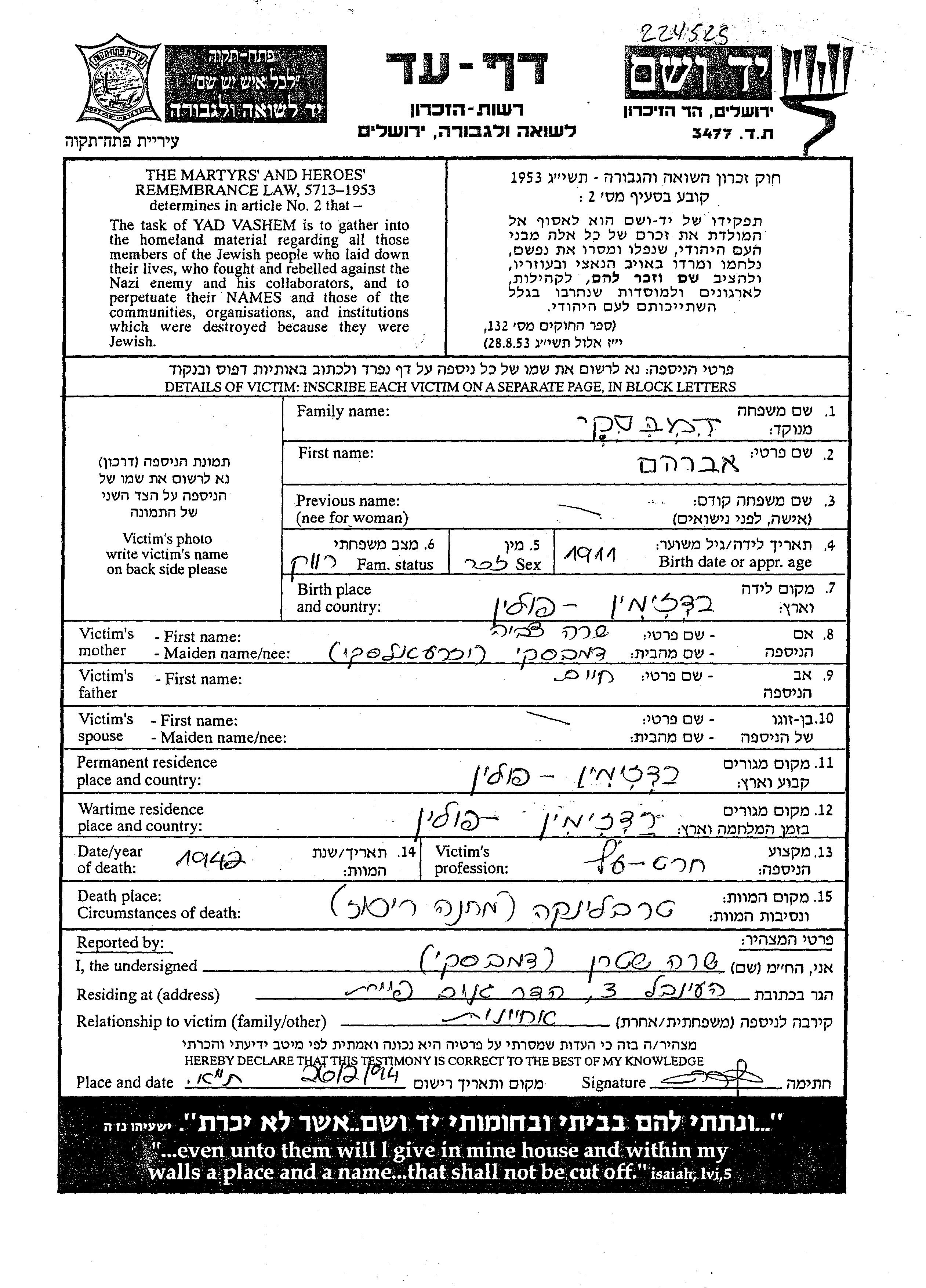 Dembski Avraham 1911 Radzymin, Pologne Feuille de témoignage