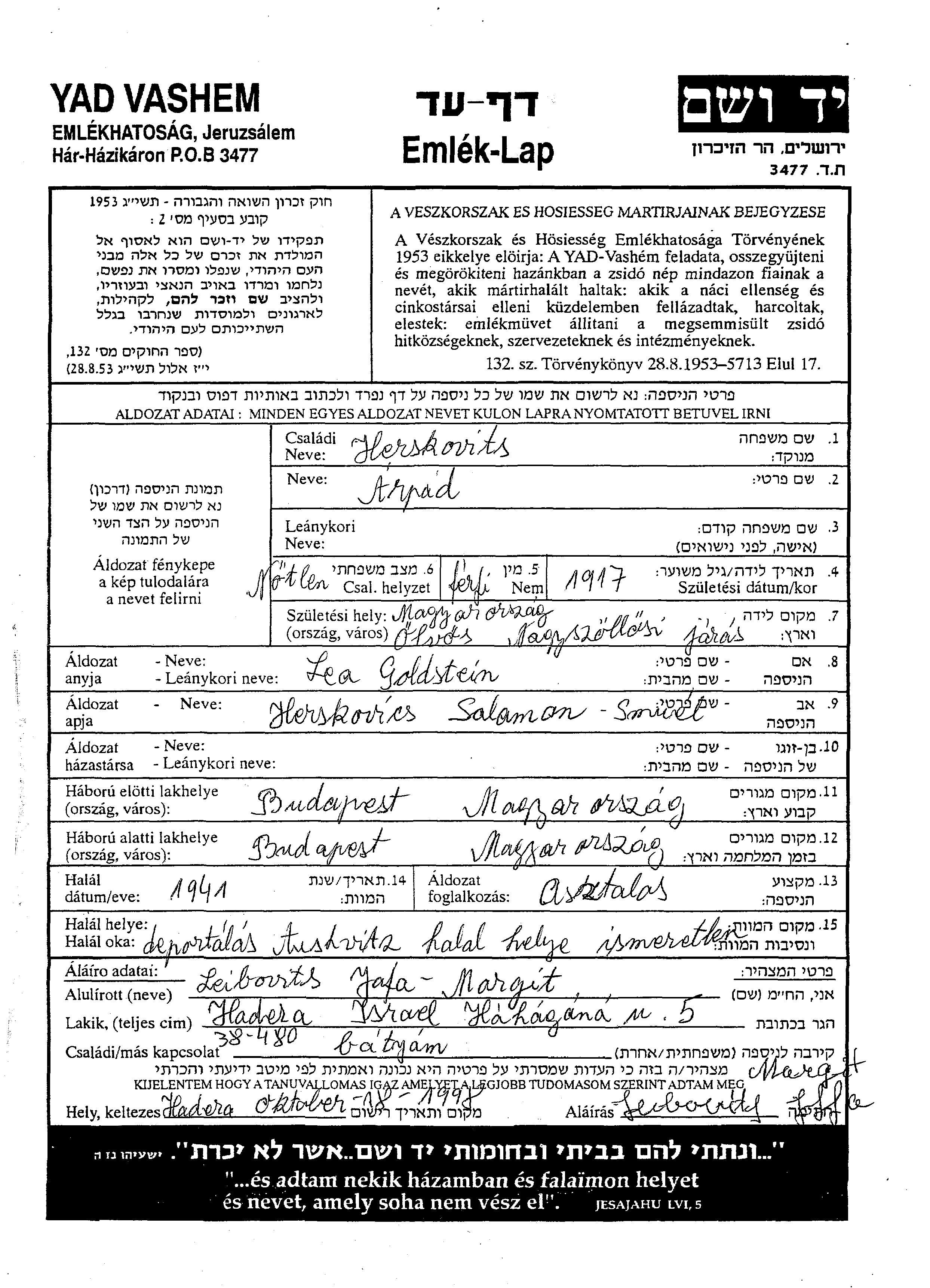 Herskovitz Arpad 1917 Budapest, Hongrie Feuille de témoignage