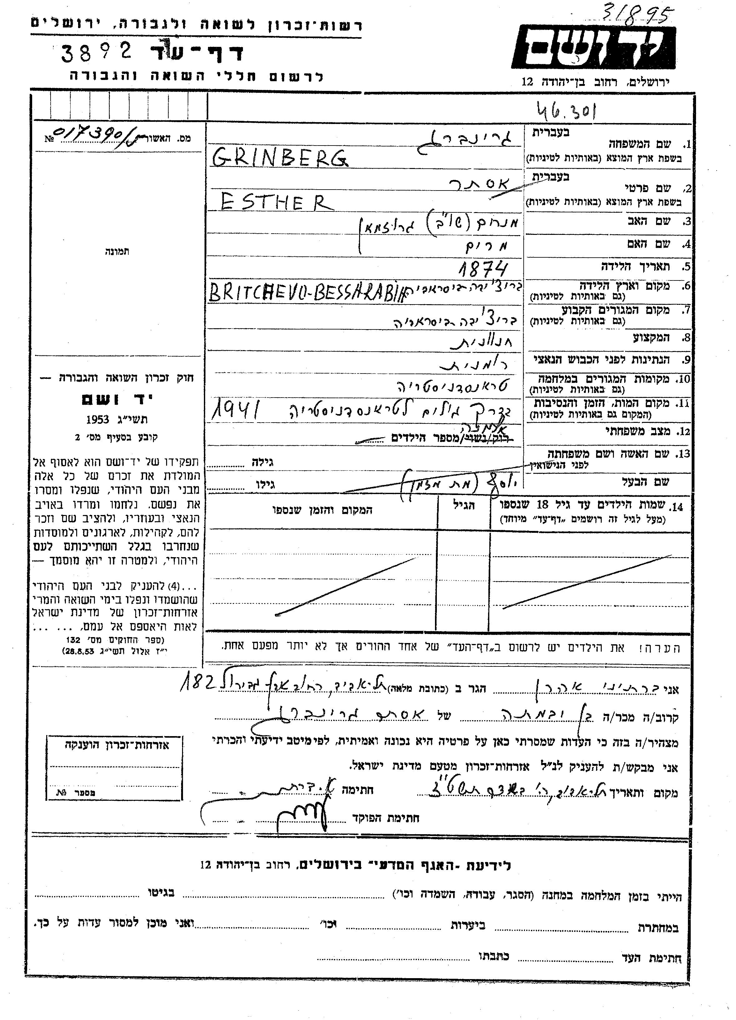 Grinberg Esther 1874 Briceva, Roumanie Feuille de témoignage