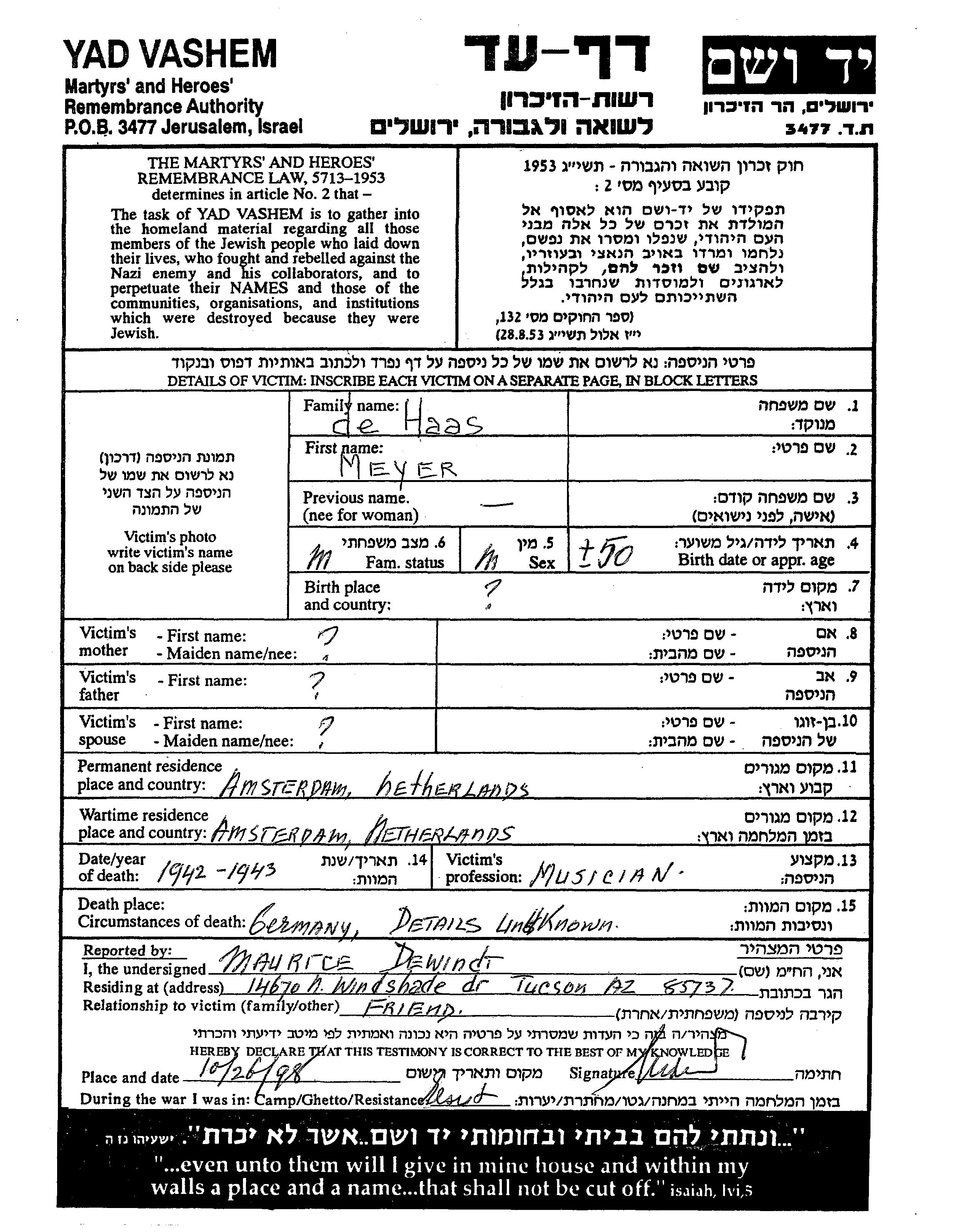 Meyer Haas de. Il était Musicien/ne et Marié. Avant la seconde guerre mondiale il vivait à Amsterdam, Pays-Bas. Au cours de la guerre, il était à Amsterdam, Pays-Bas.