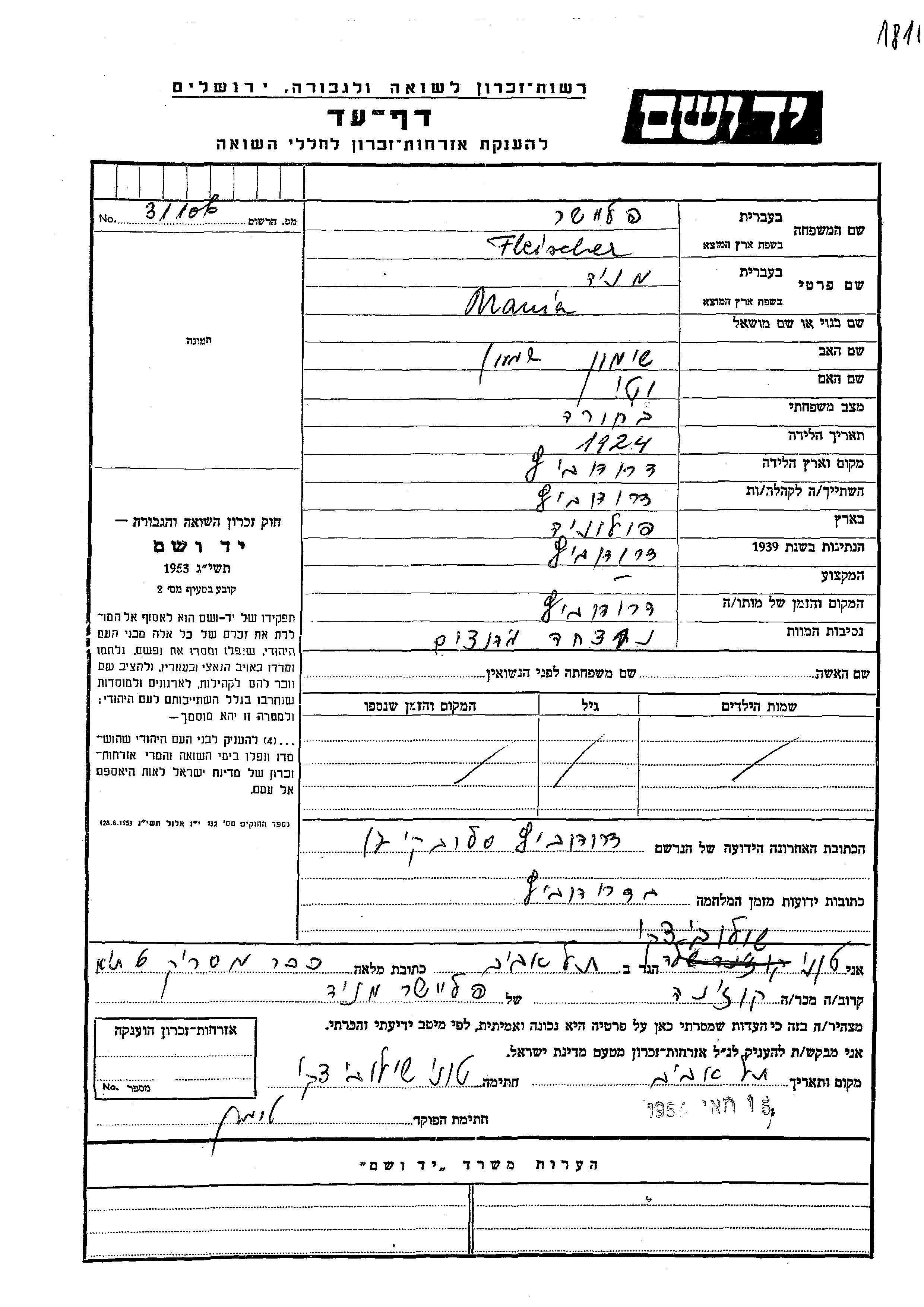 Fleischer Mania 1924 Drohovitz, Pologne Feuille de témoignage