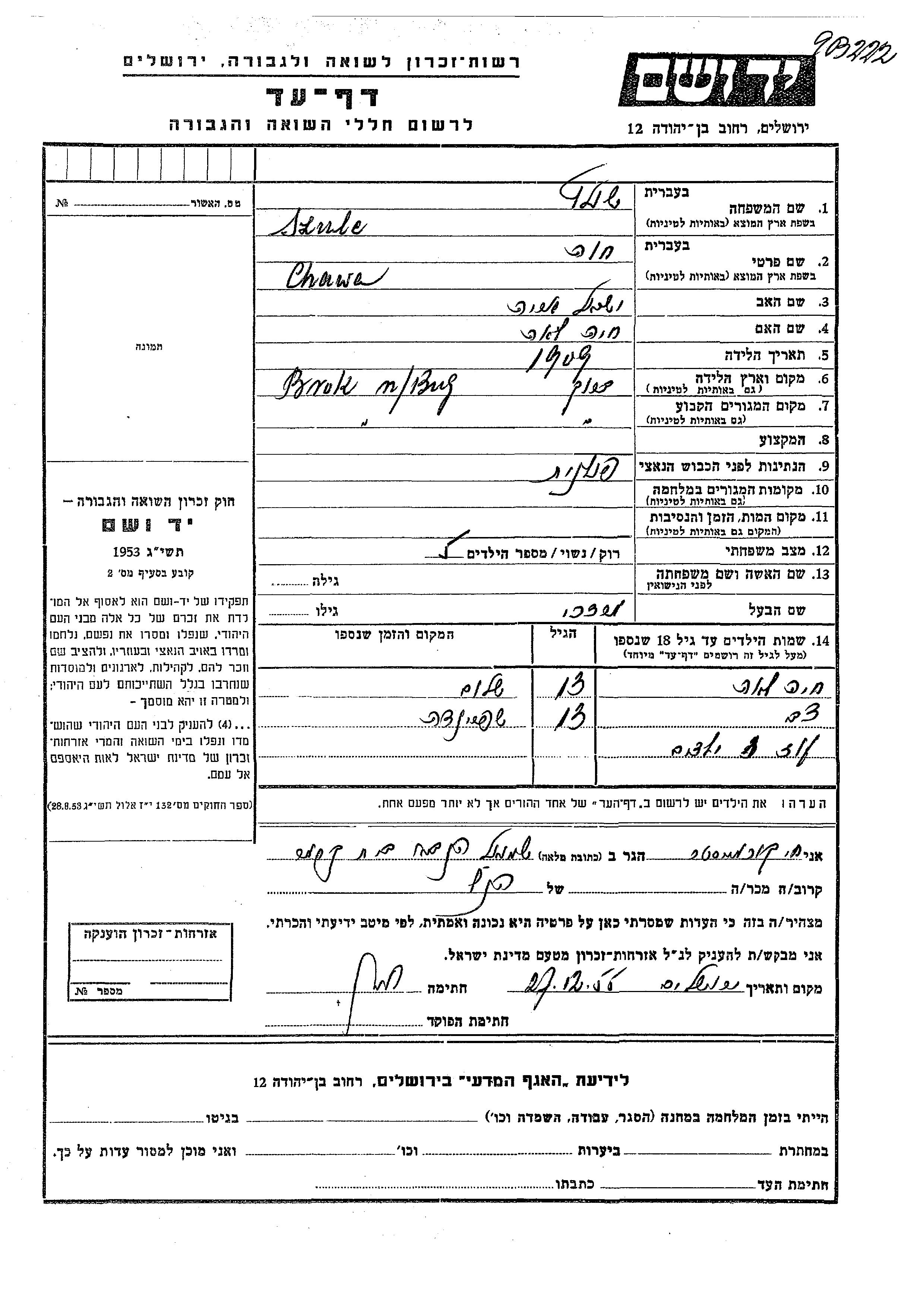 Szulc Chawa 1909 endroit inconnu, Feuille de témoignage