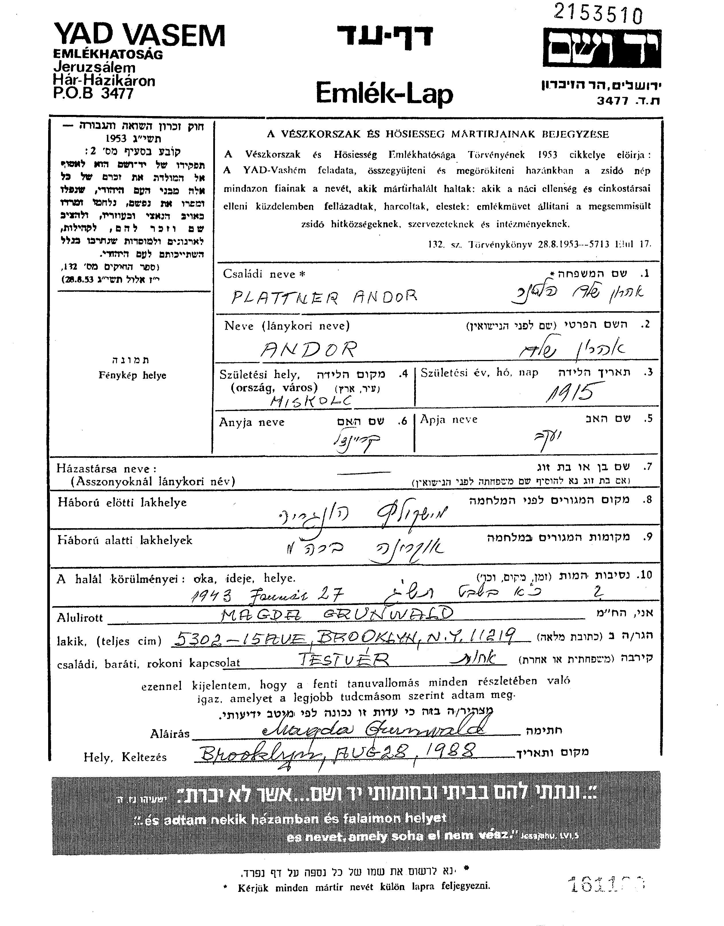 Plattner Andor Aharon Shalom 1915 Miskolc, Hongrie Feuille de témoignage