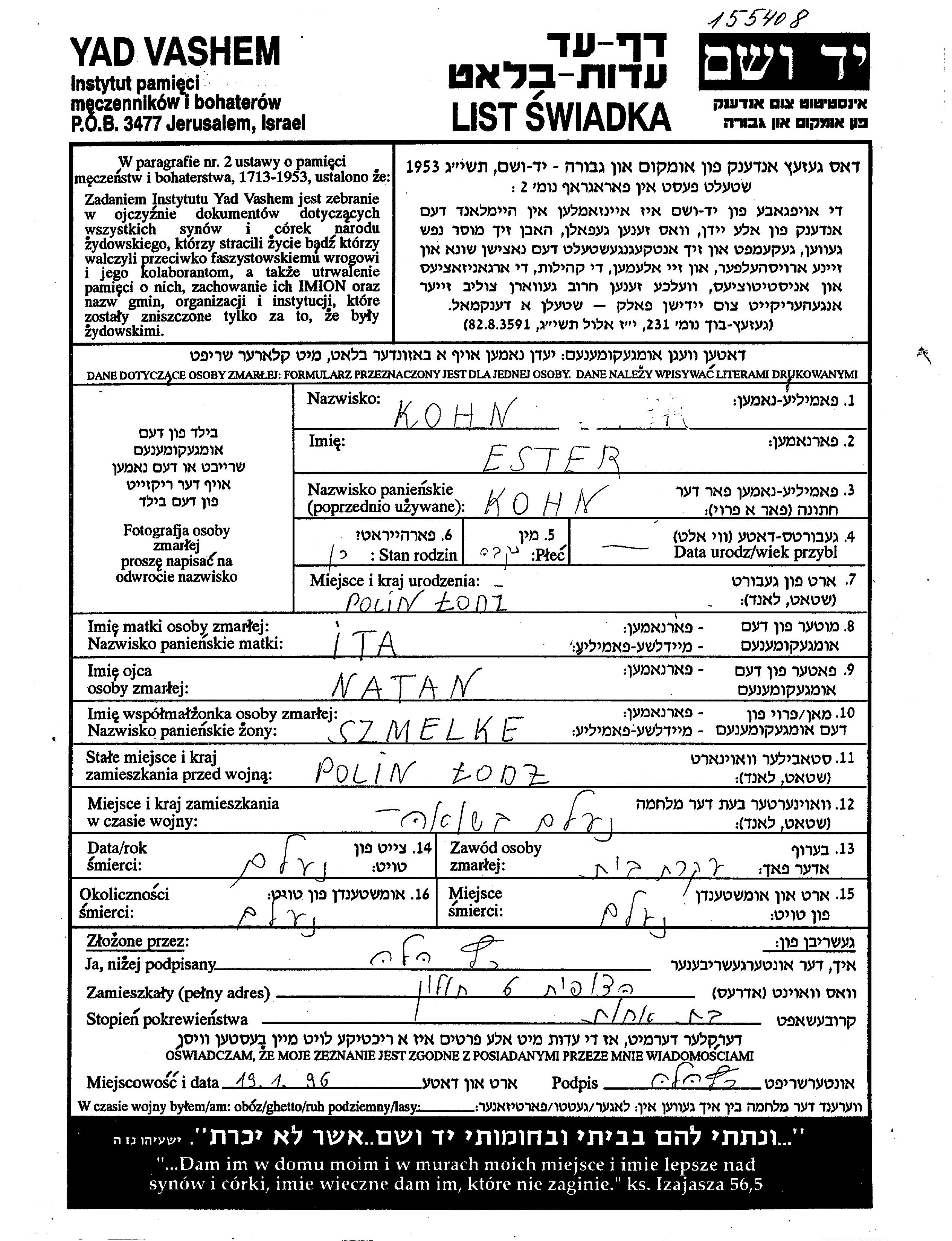 Kohn Kun Ester Lodz, Pologne Feuille de témoignage