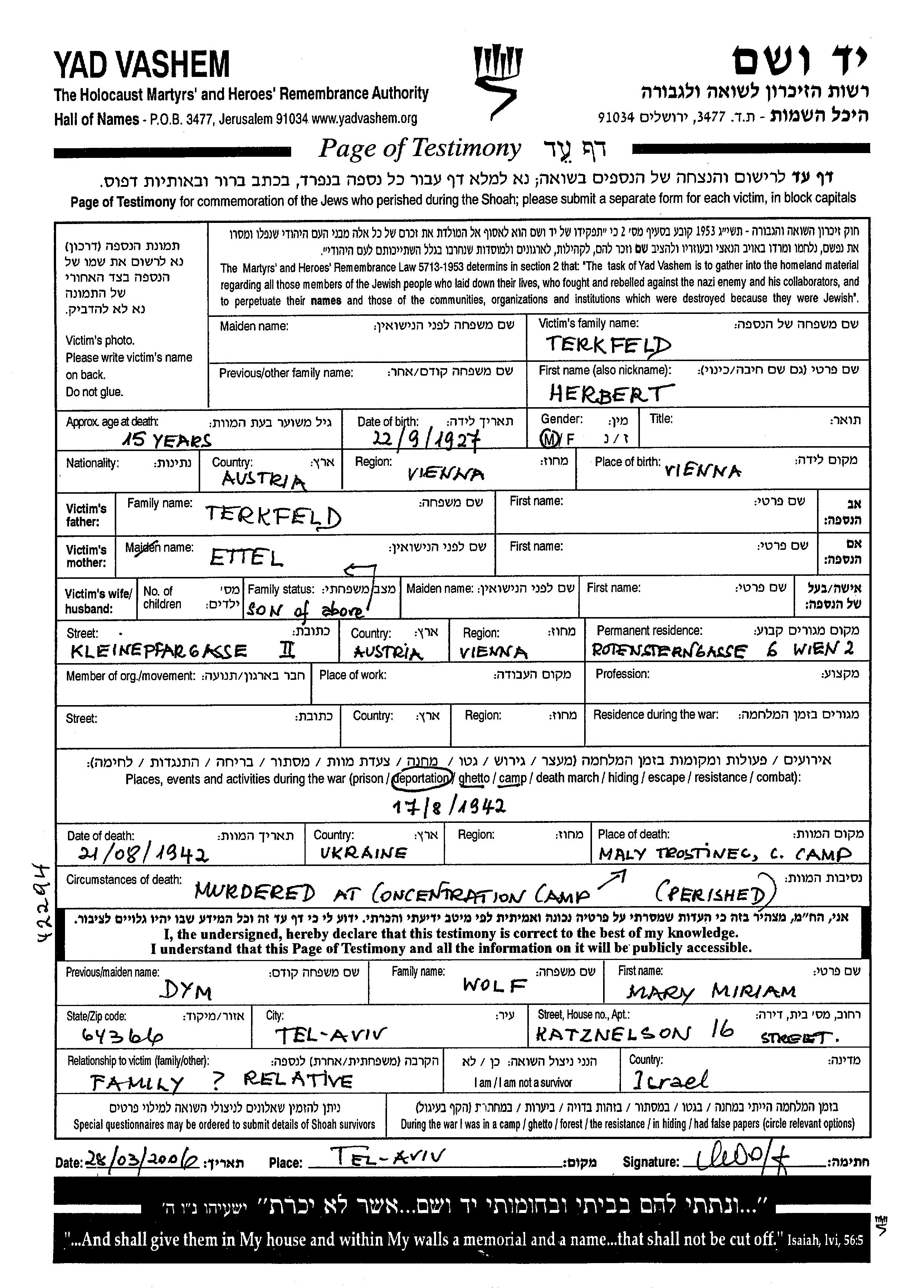 Terkfeld Herbert 1927 Wienna, Autriche Feuille de témoignage