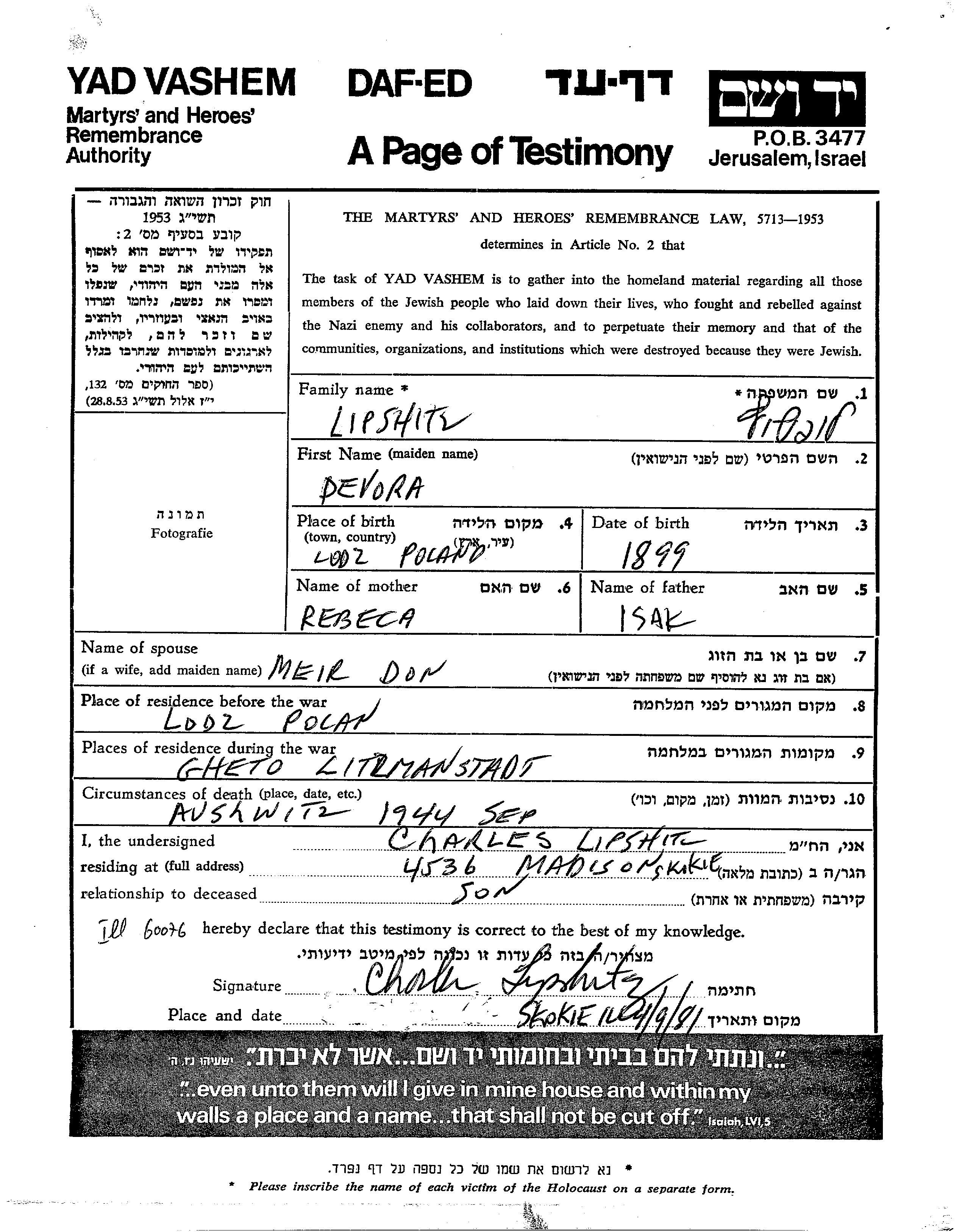 Lipshitz Devora 1899 Lodz, Pologne Feuille de témoignage