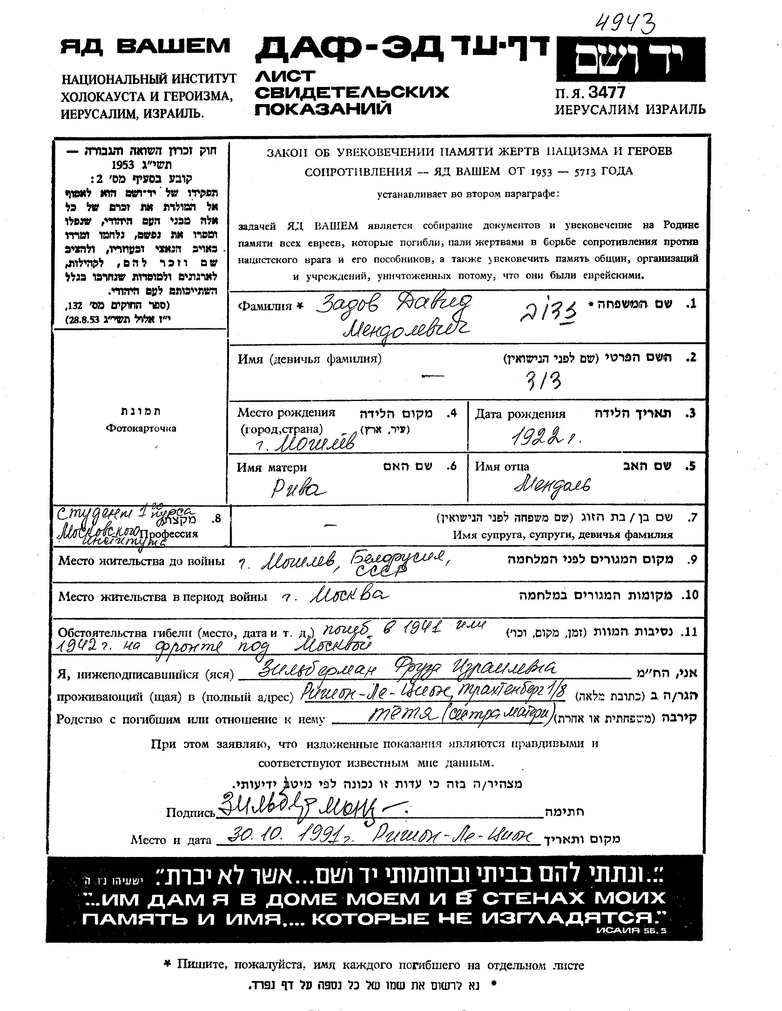 Zadov David 1922 Mogilev, Bélorussie (URSS) Feuille de témoignage