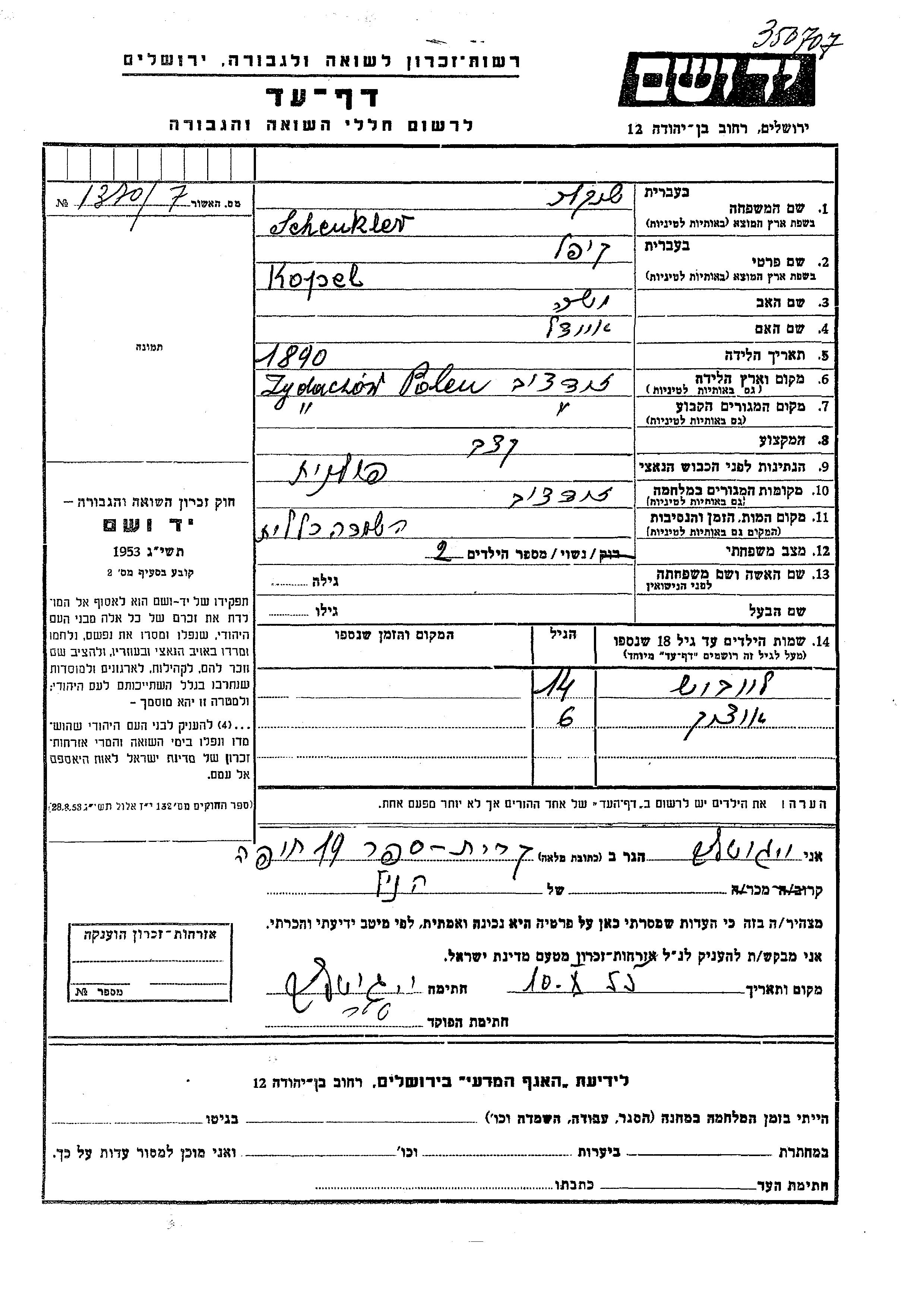 Kopel Schenkler est né à Zydachow, Pologne en 1890, fils de Moshe et de Eidel. Il était Boucher et Marié. Avant la seconde guerre mondiale il vivait à Zydachow, Pologne. Au cours de la guerre, il était à Zydachow, Pologne.