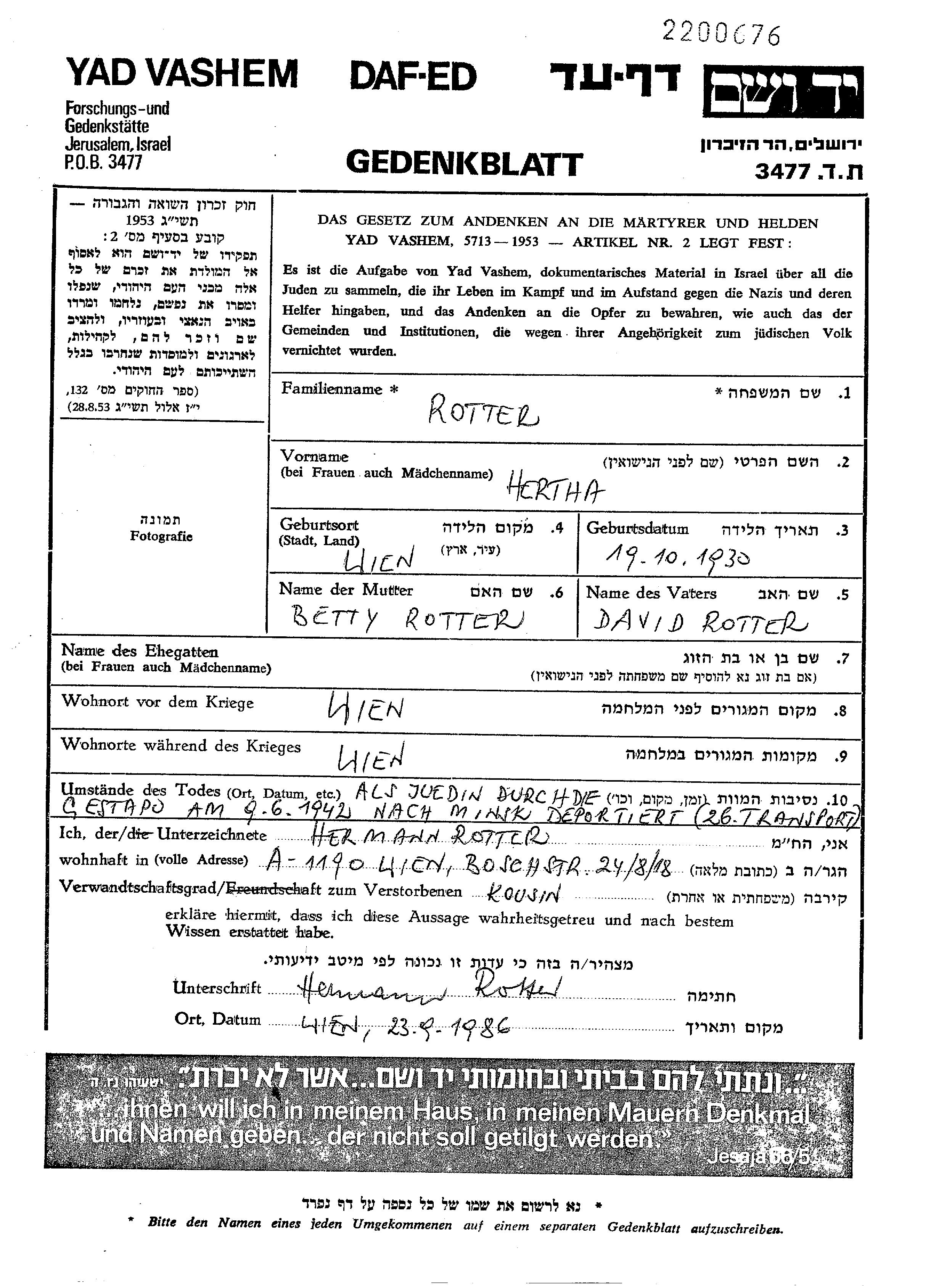 Herta Rotter est née à Wien, Autriche en 1930. Avant la seconde guerre mondiale elle vivait à Wien, Autriche.