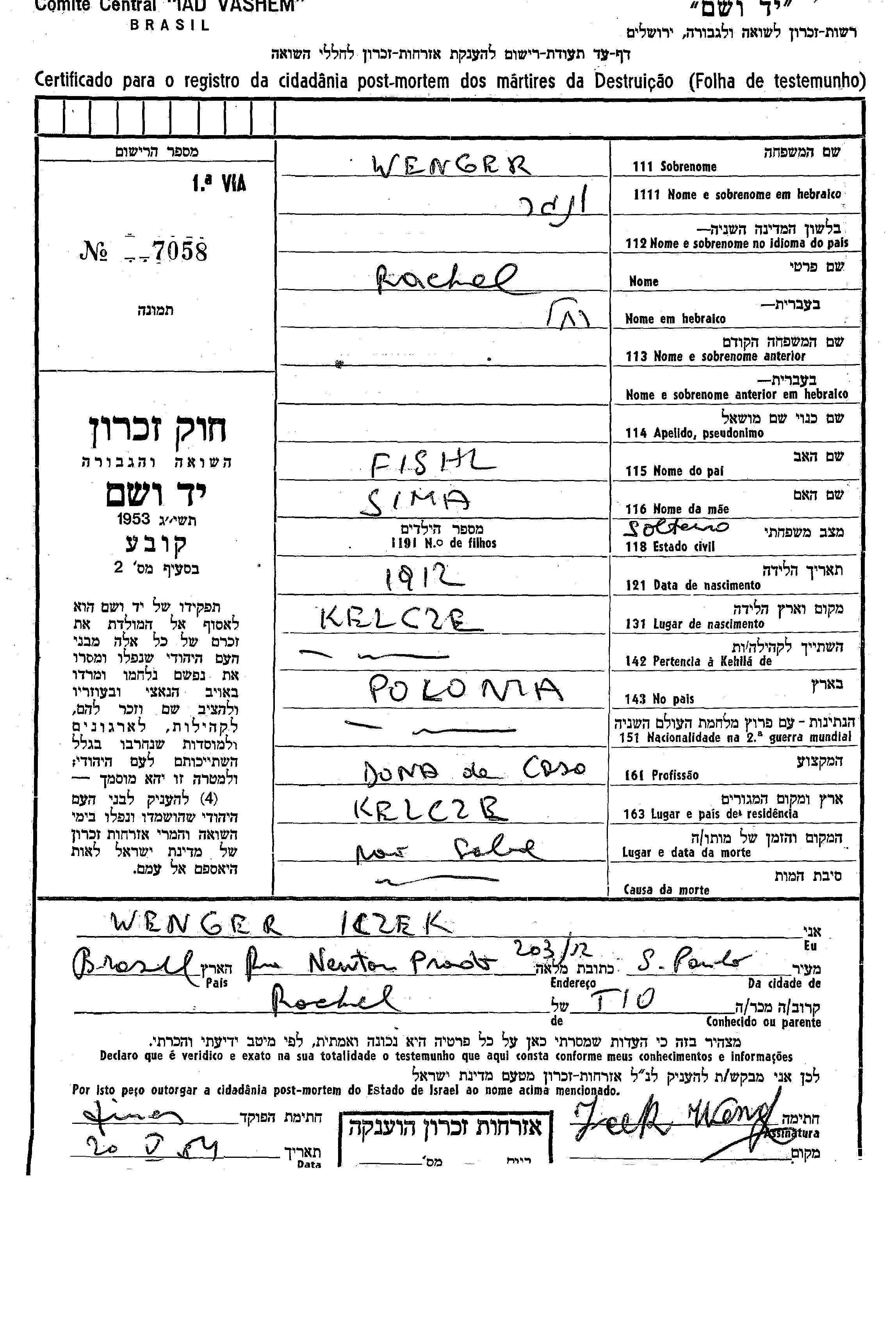 Wenger Rachel 1912 Kielce, Pologne Feuille de témoignage