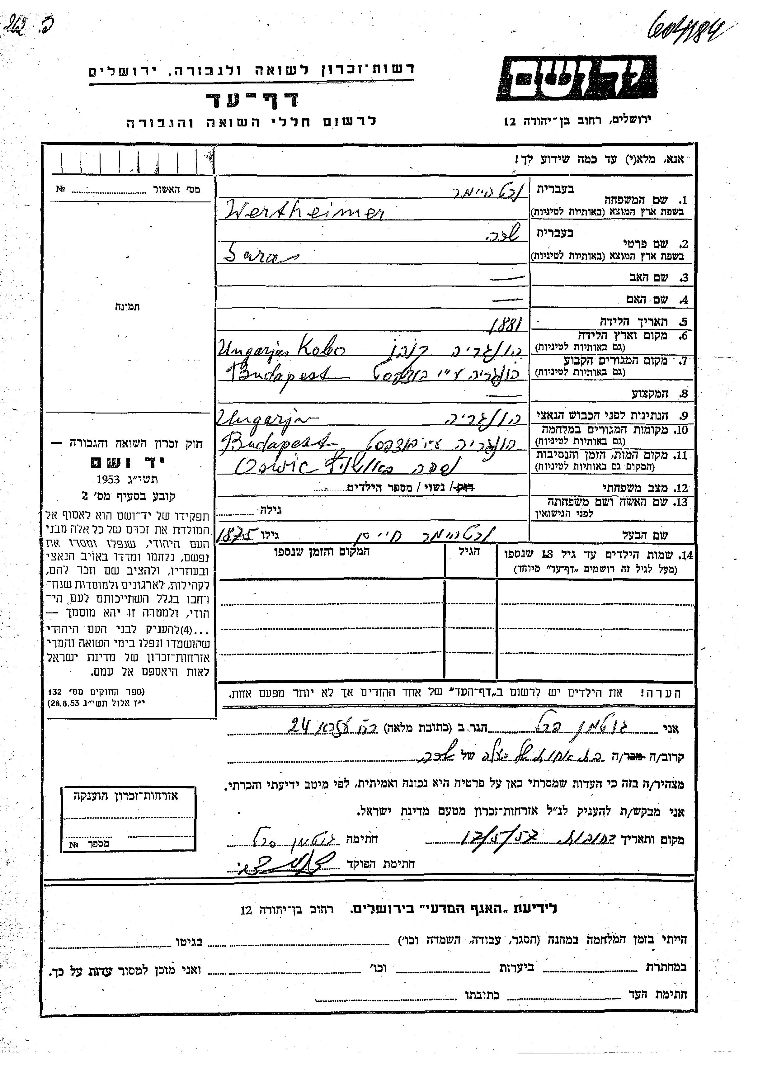 Wertheimer Sara 1881 Budapest, Hongrie Feuille de témoignage