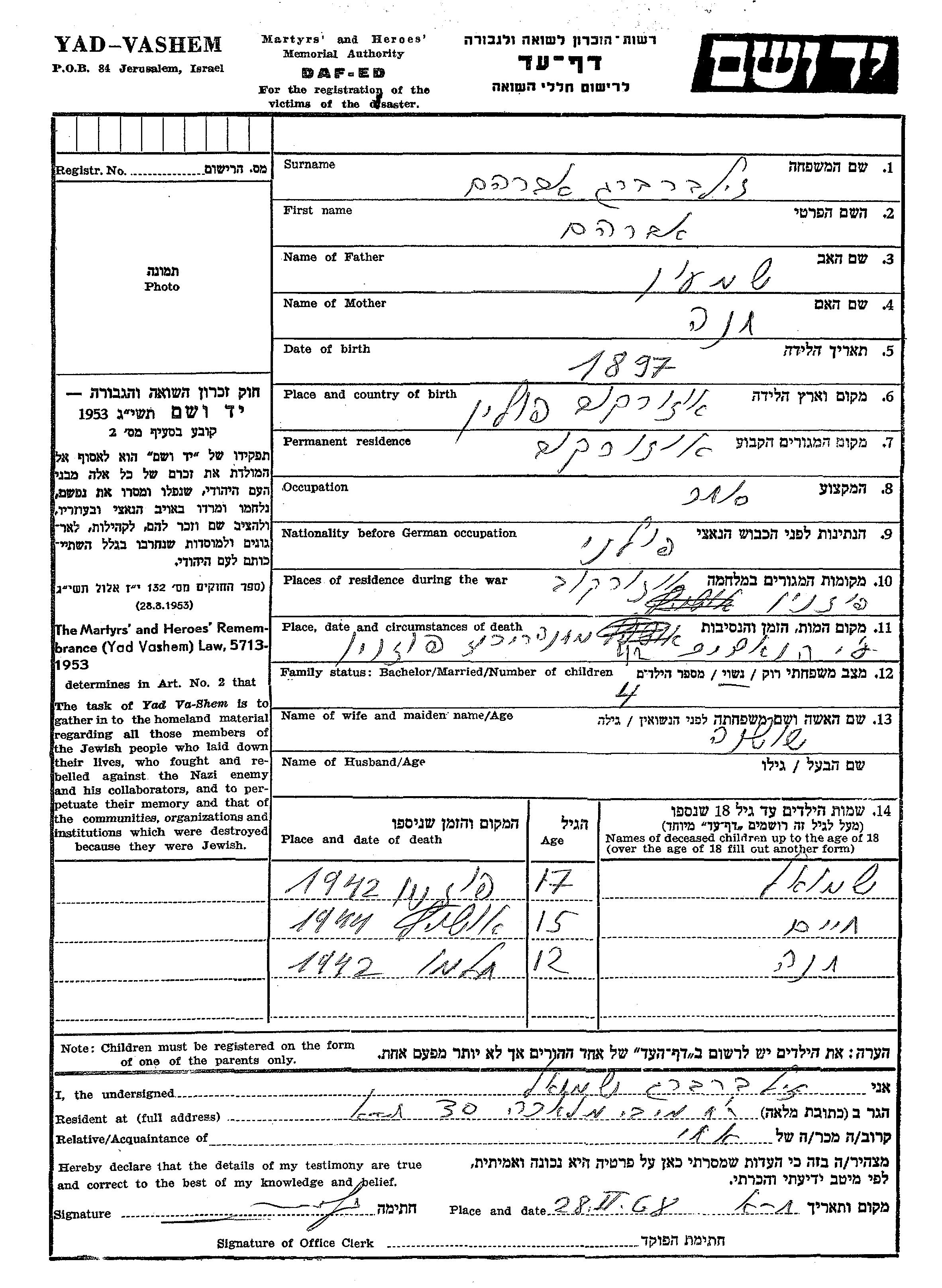 Avraham a été assassiné pendant la Shoah. Lieu de la mort: Poznan, Pologne en 1942.