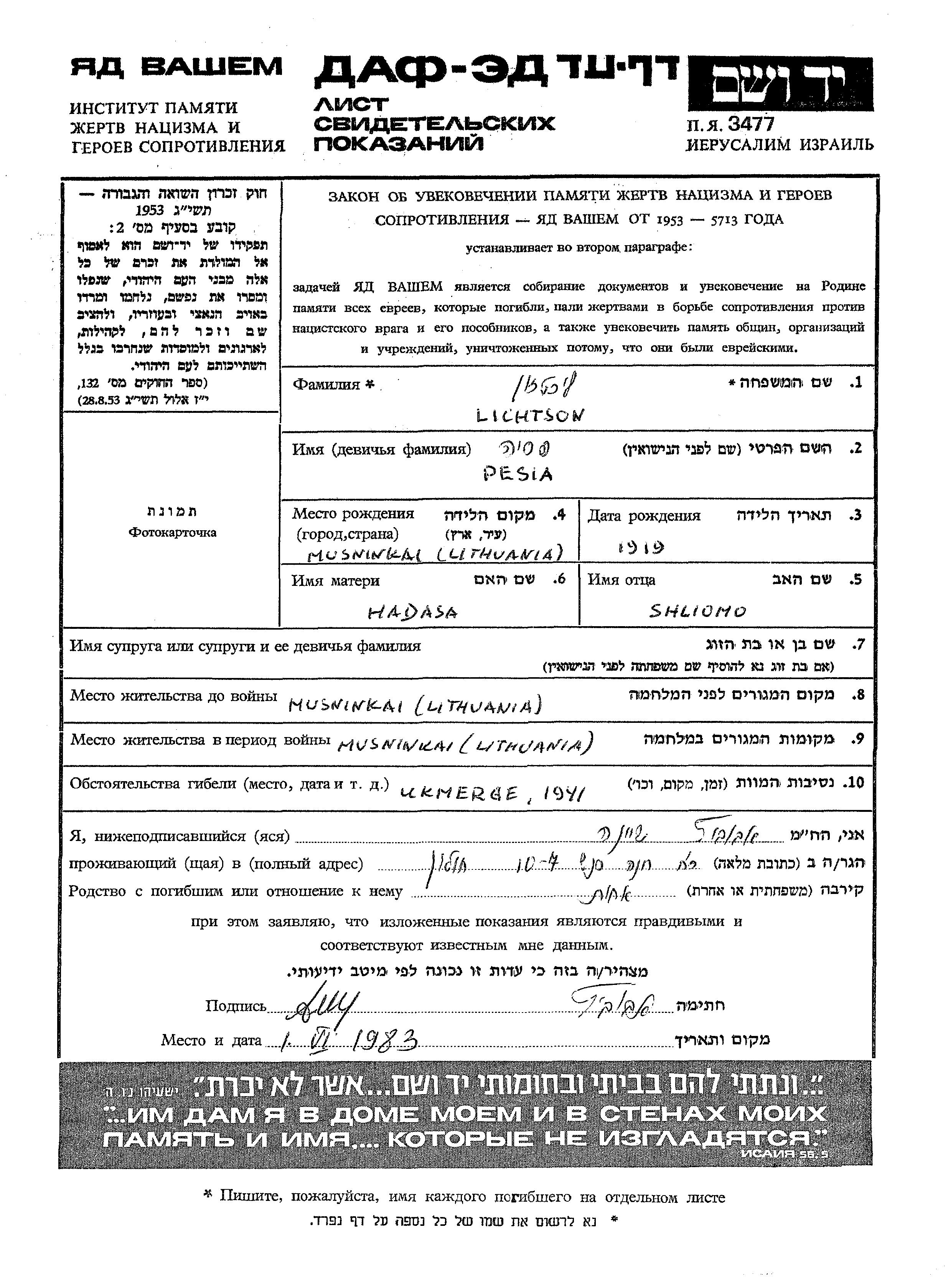Lichtson Pesia 1919 Musninkai, Lituanie Feuille de témoignage
