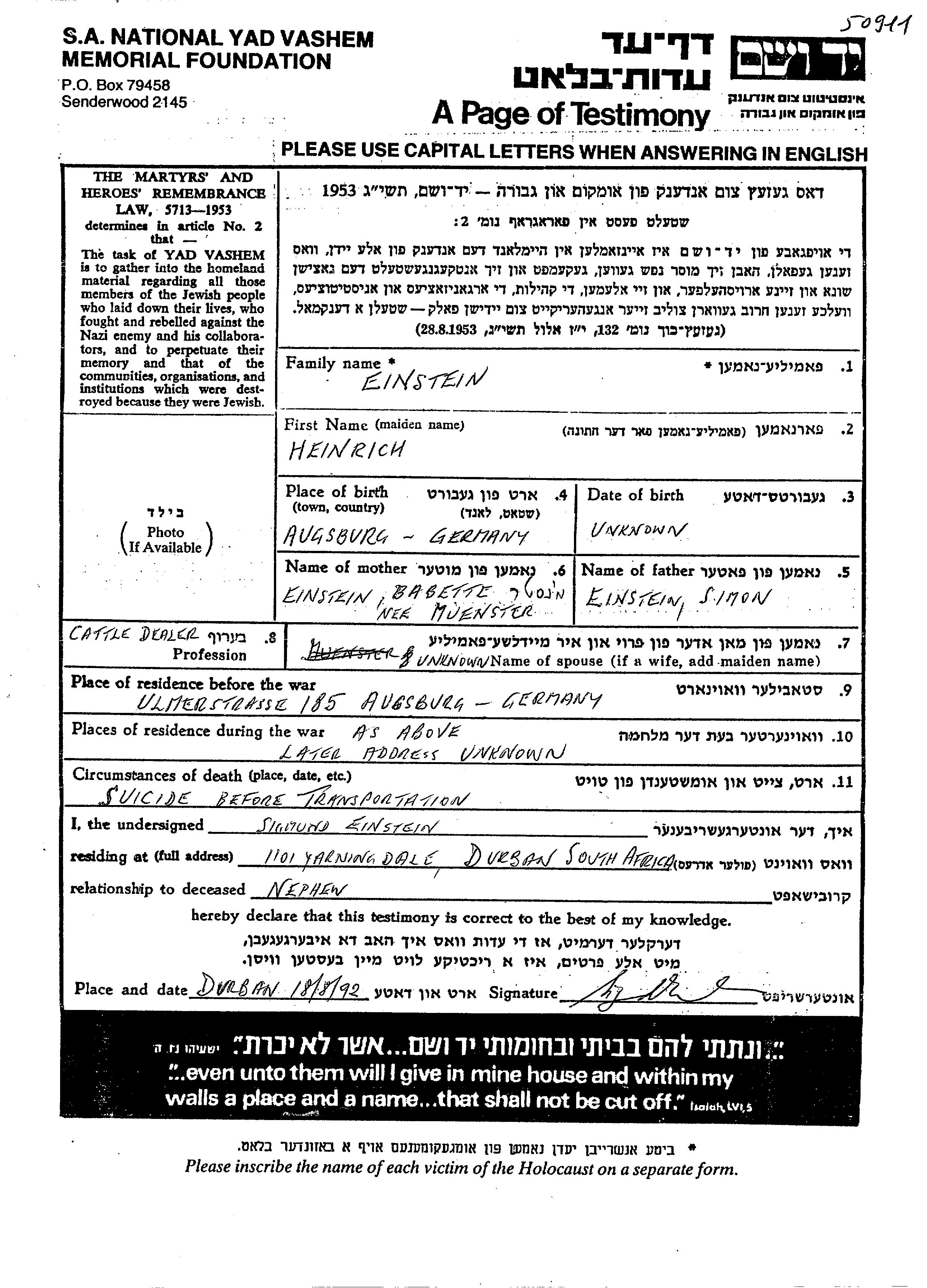 Einstein Heinrich Augsburg, Allemagne Feuille de témoignage