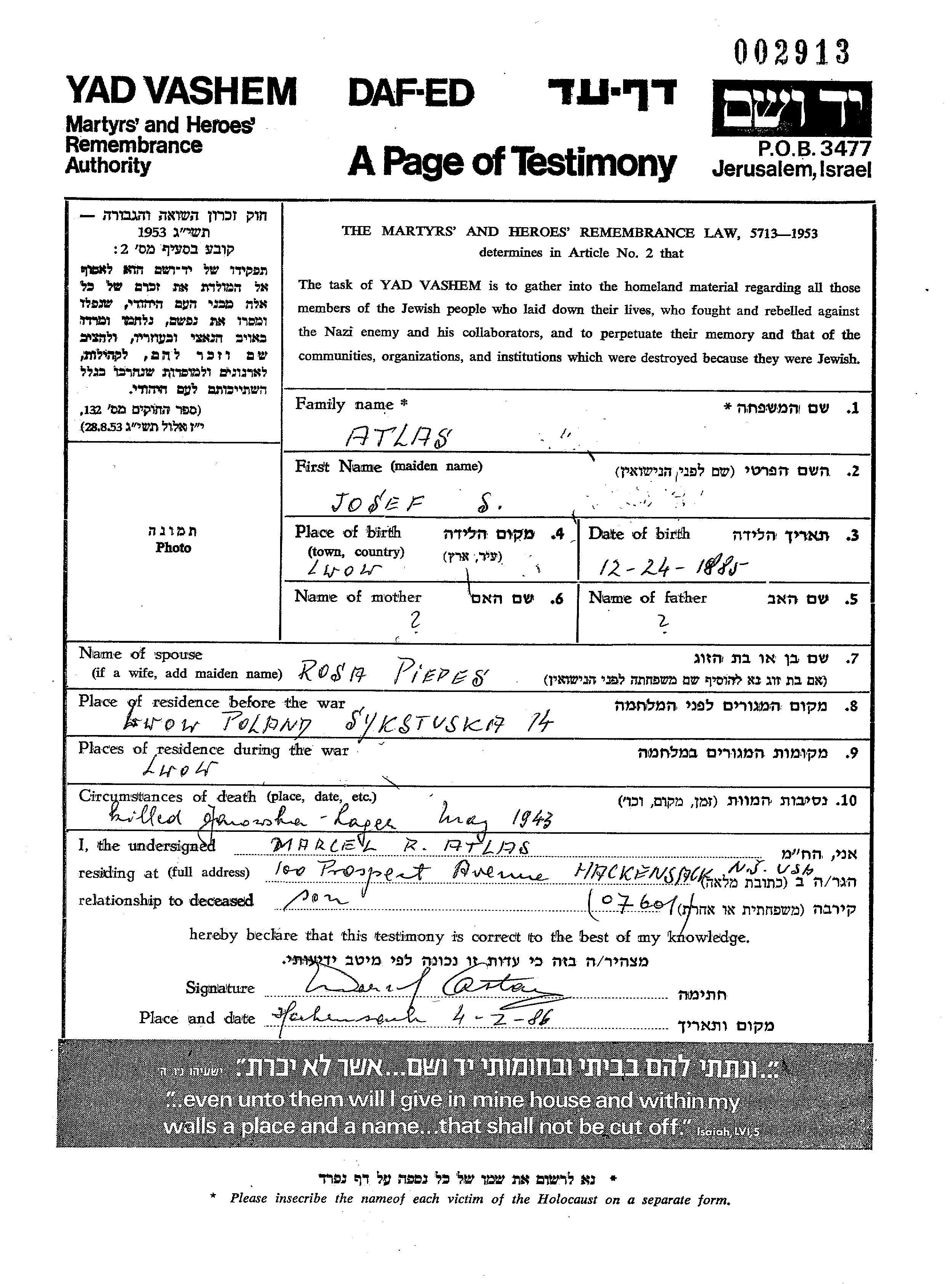 Atlas Josef 1885 Lwow, Pologne Feuille de témoignage