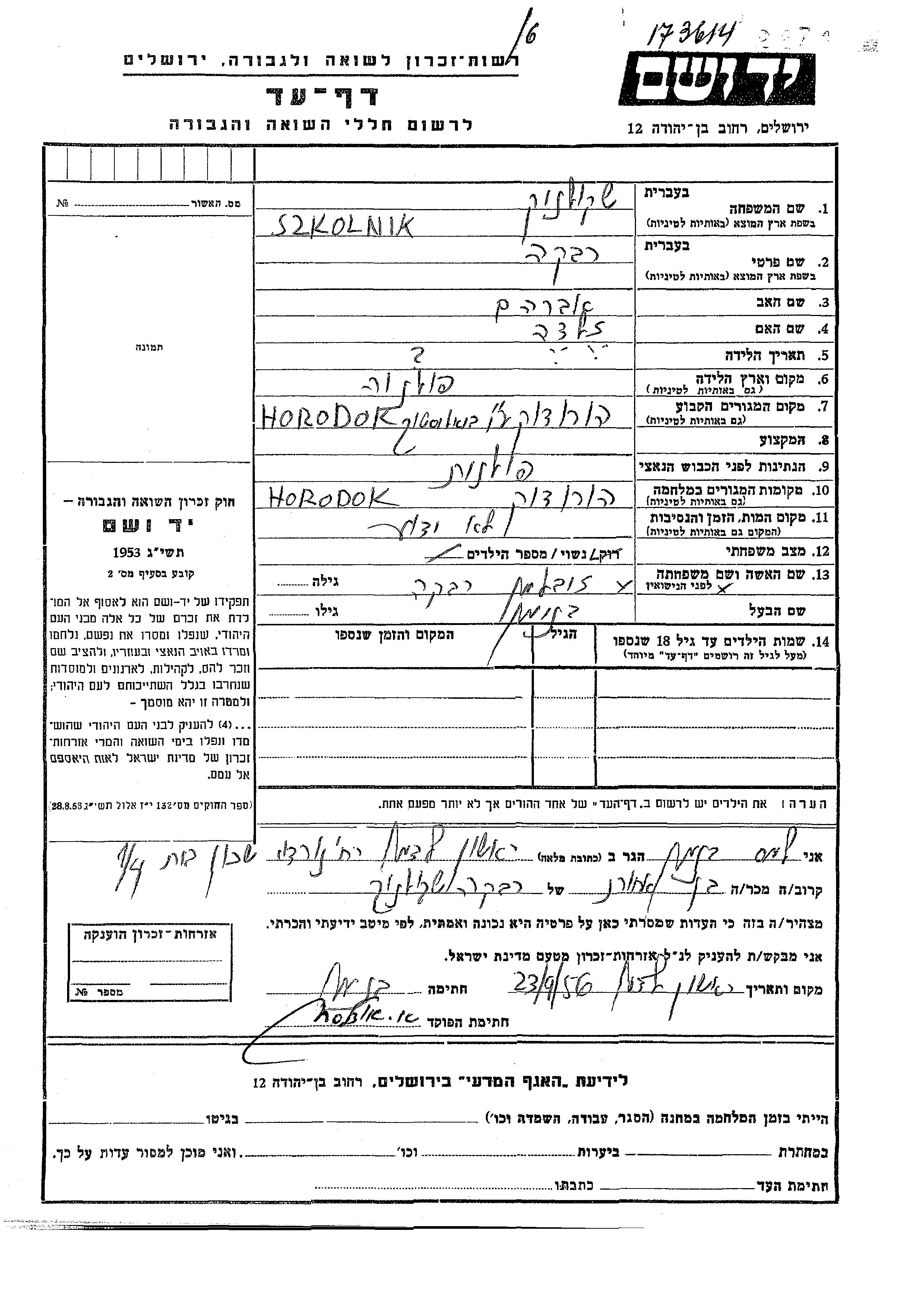Szkolnik Rivka Horodek, Pologne Feuille de témoignage