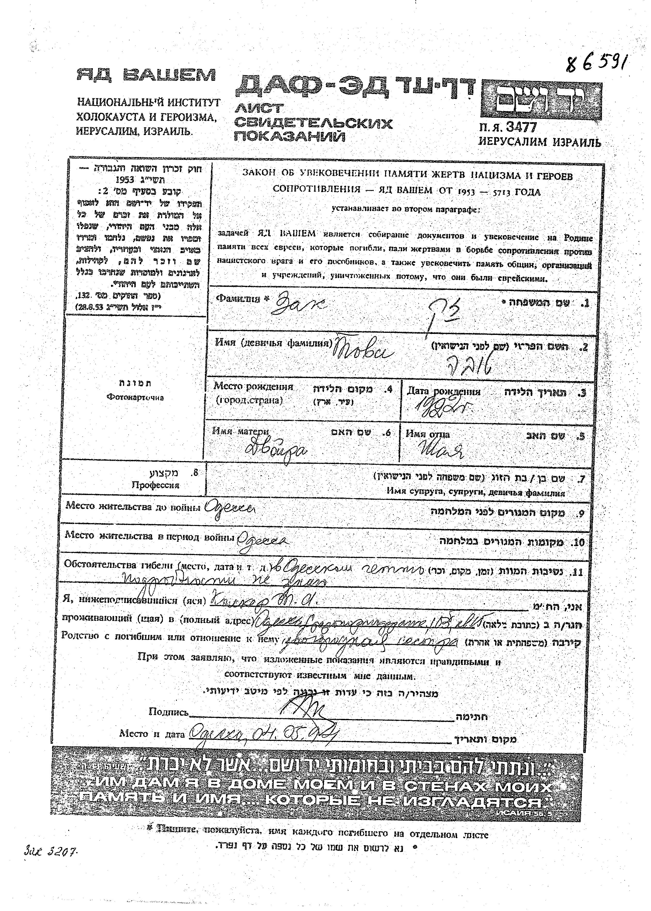Zak Tova 1922 Odessa, Ukraine (URSS) Feuille de témoignage