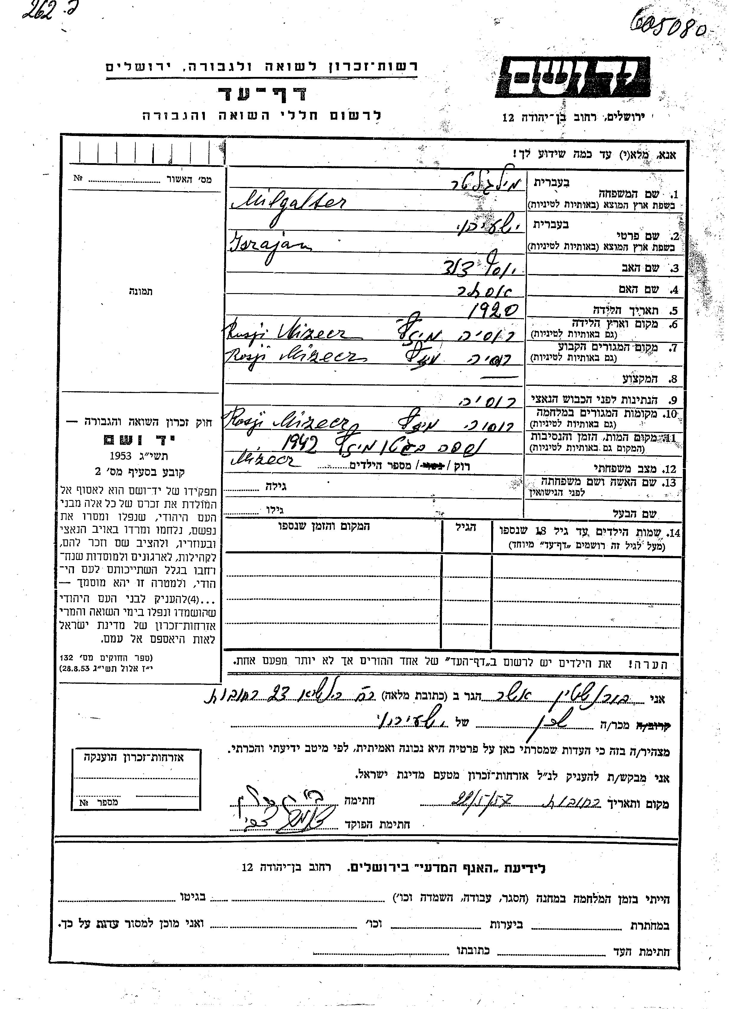 Iszajau Milgalter Milglater est né à Mizocz, Pologne en 1920. Avant la seconde guerre mondiale il vivait à Mizocz, Pologne.