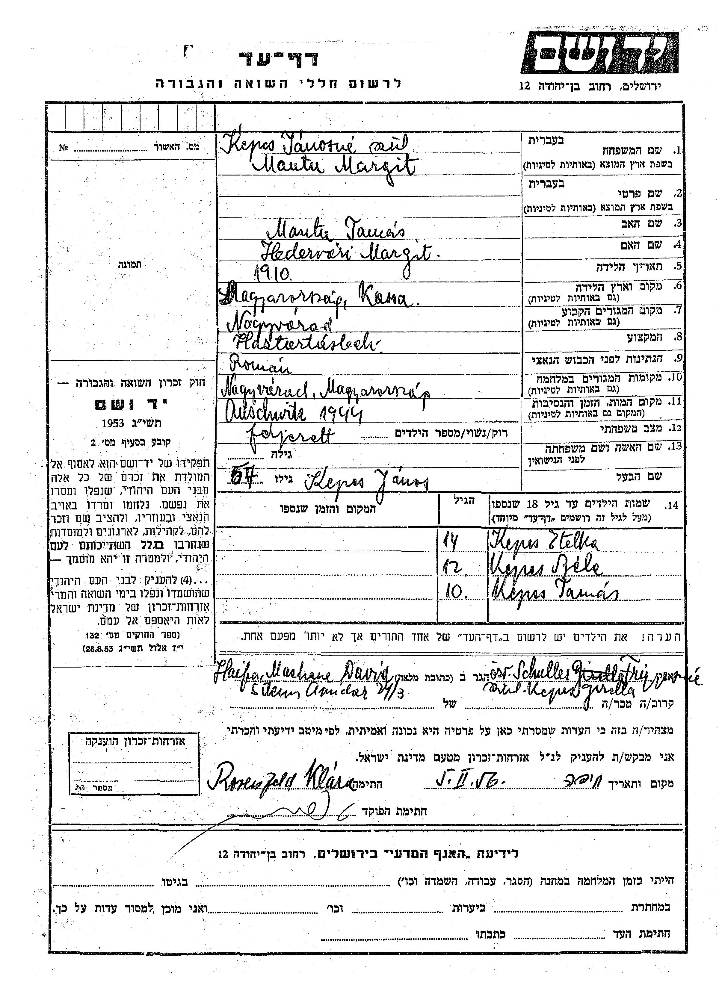 Kepes Tamas Nagyvarad, Roumanie Feuille de témoignage