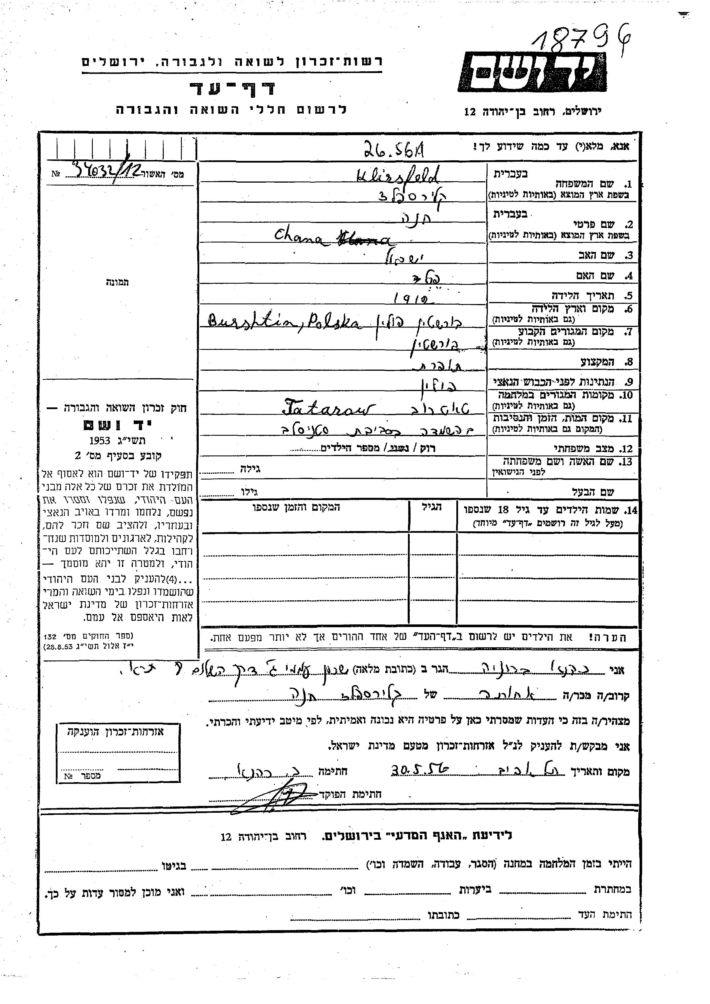 Klirsfeld Chana 1912 Bursztyn, Pologne Feuille de témoignage