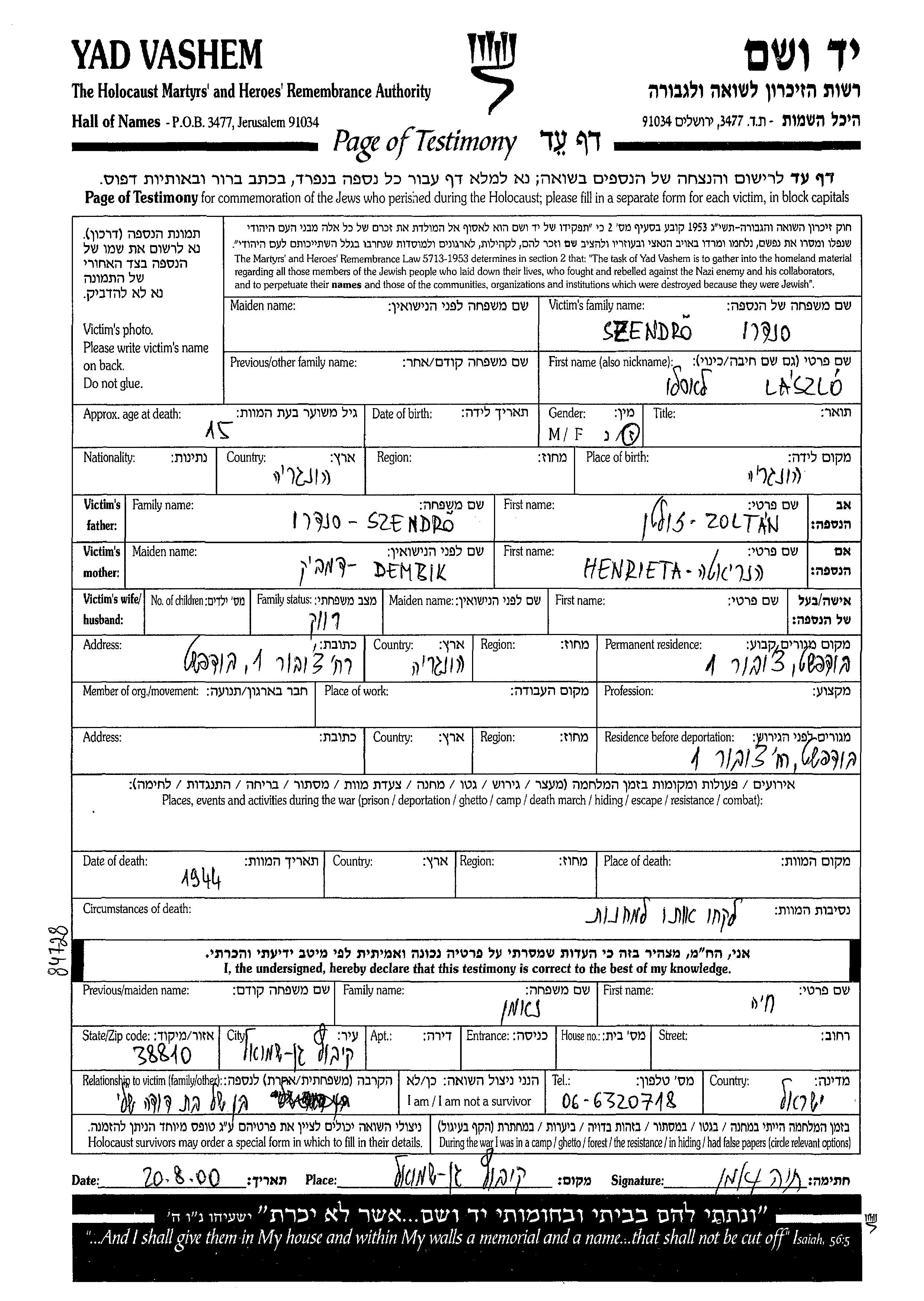 Szendro Laszlo Budapest, Hongrie Feuille de témoignage