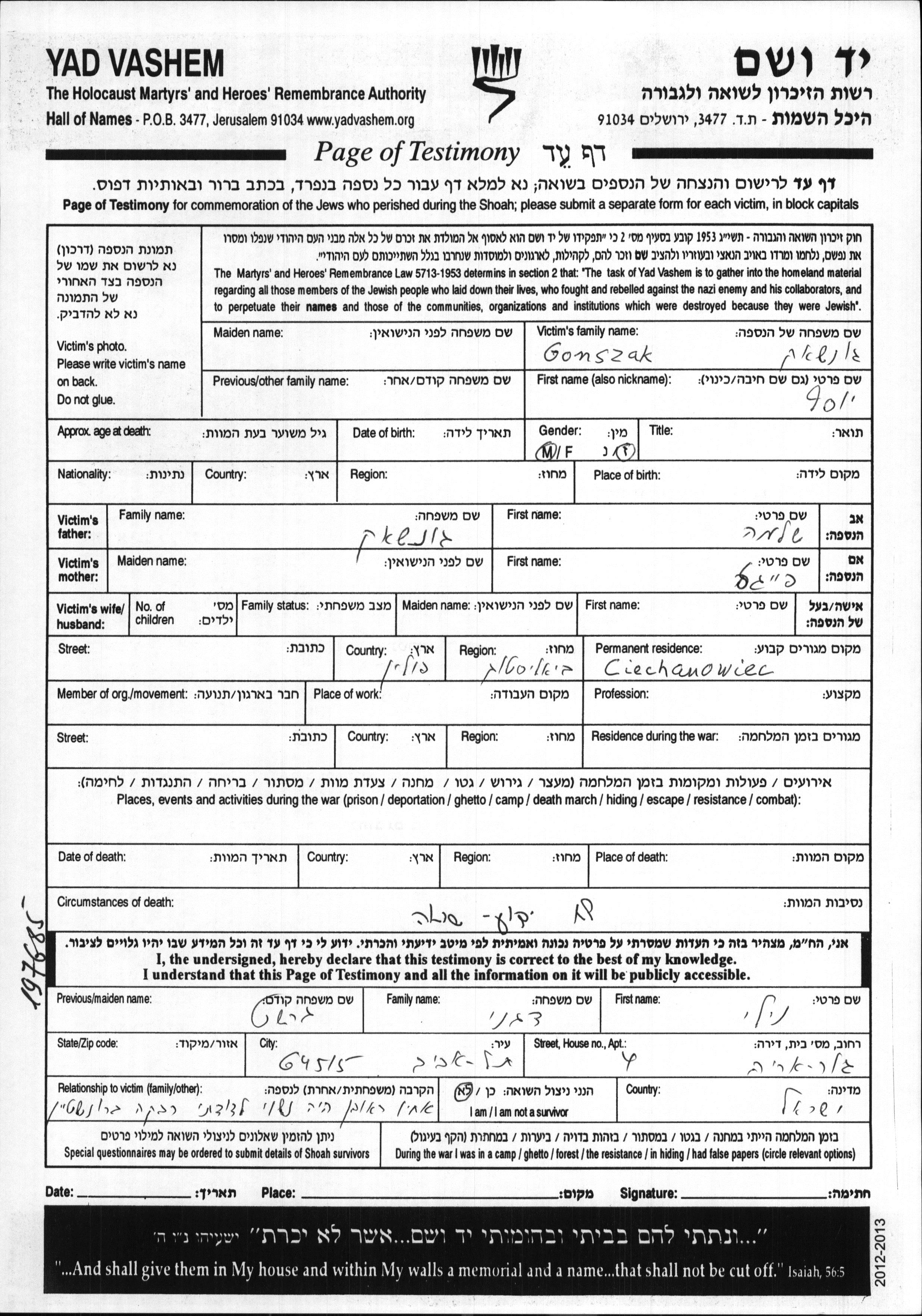 Gonszak | Yosef | Ciechanowiec, Pologne | Feuille de témoignage | |