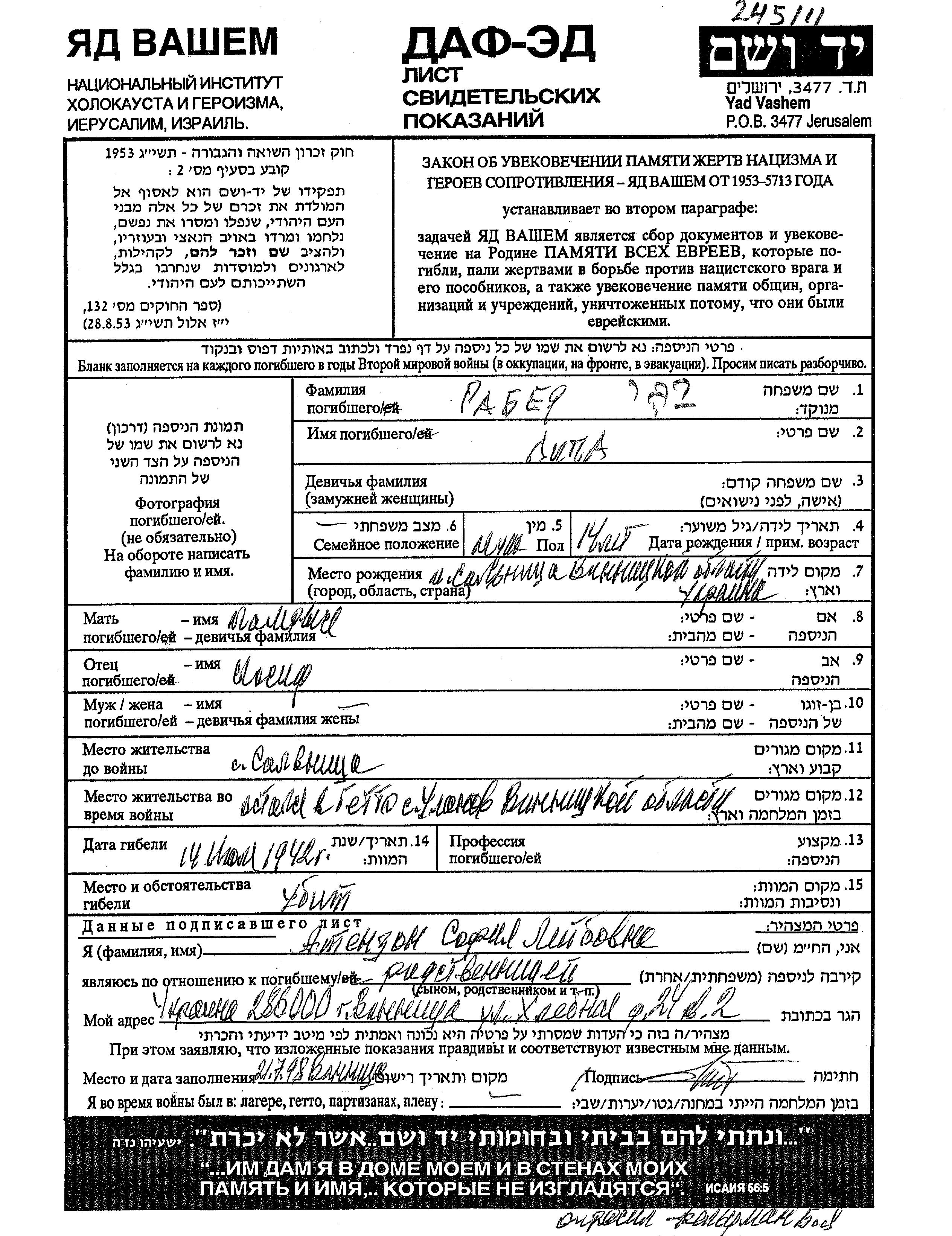 Yad Vashem - Pages of Testimony Names Memorial Collection