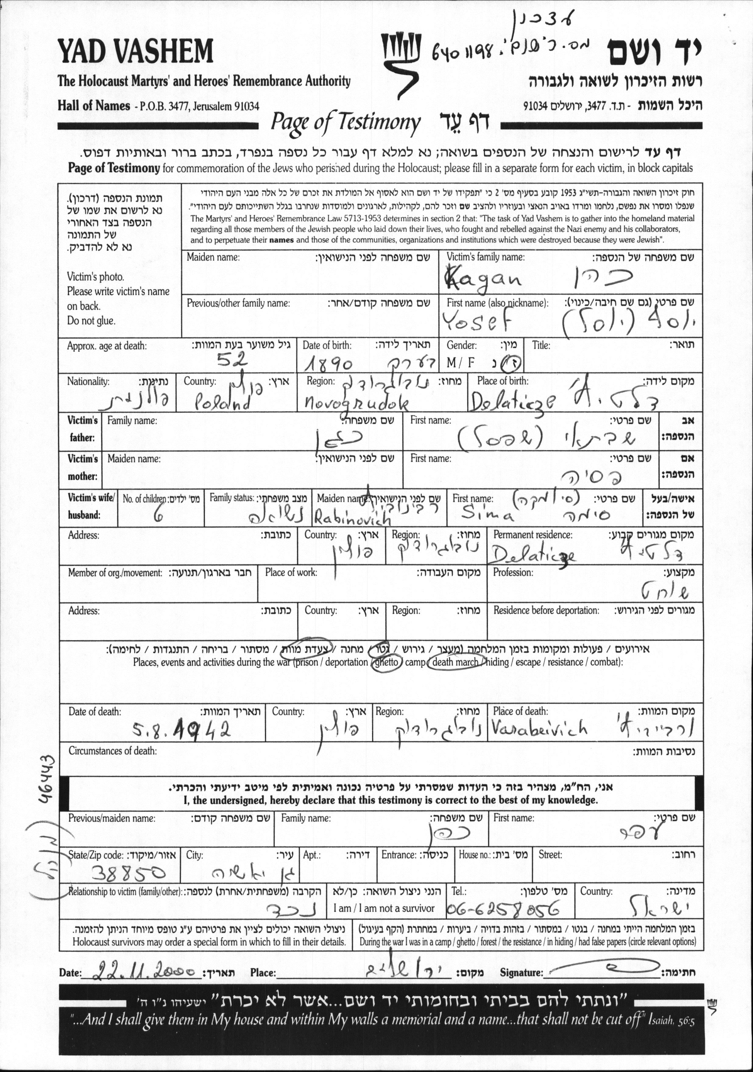 Yosef Cohen Kagan est né à Delyatyche, Pologne en 1890. Il était Abatteur rituel. Avant la seconde guerre mondiale il vivait à Delatycze, Pologne.