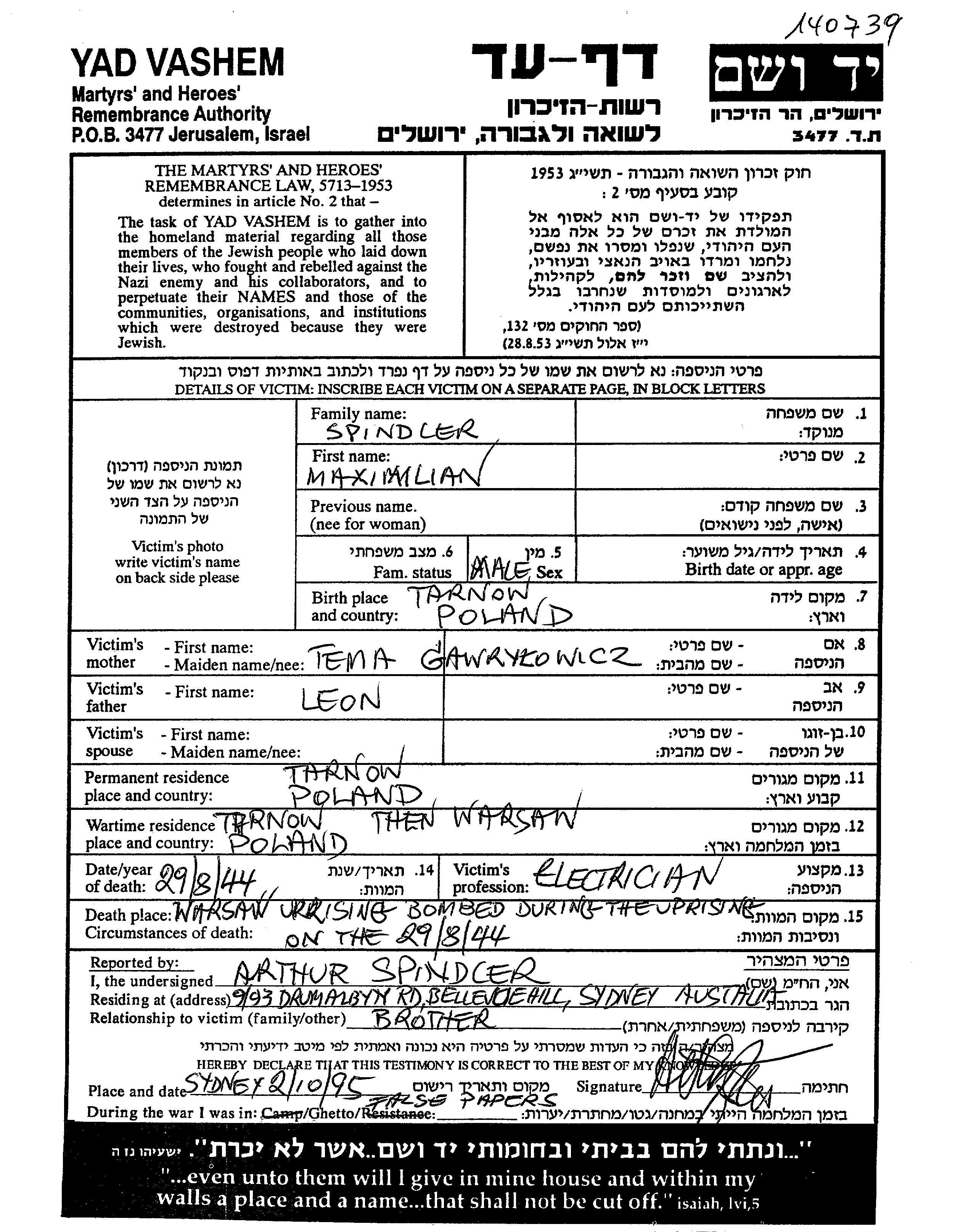 Spindler Maksymilian 1922 Tarnow, Pologne Feuille de témoignage