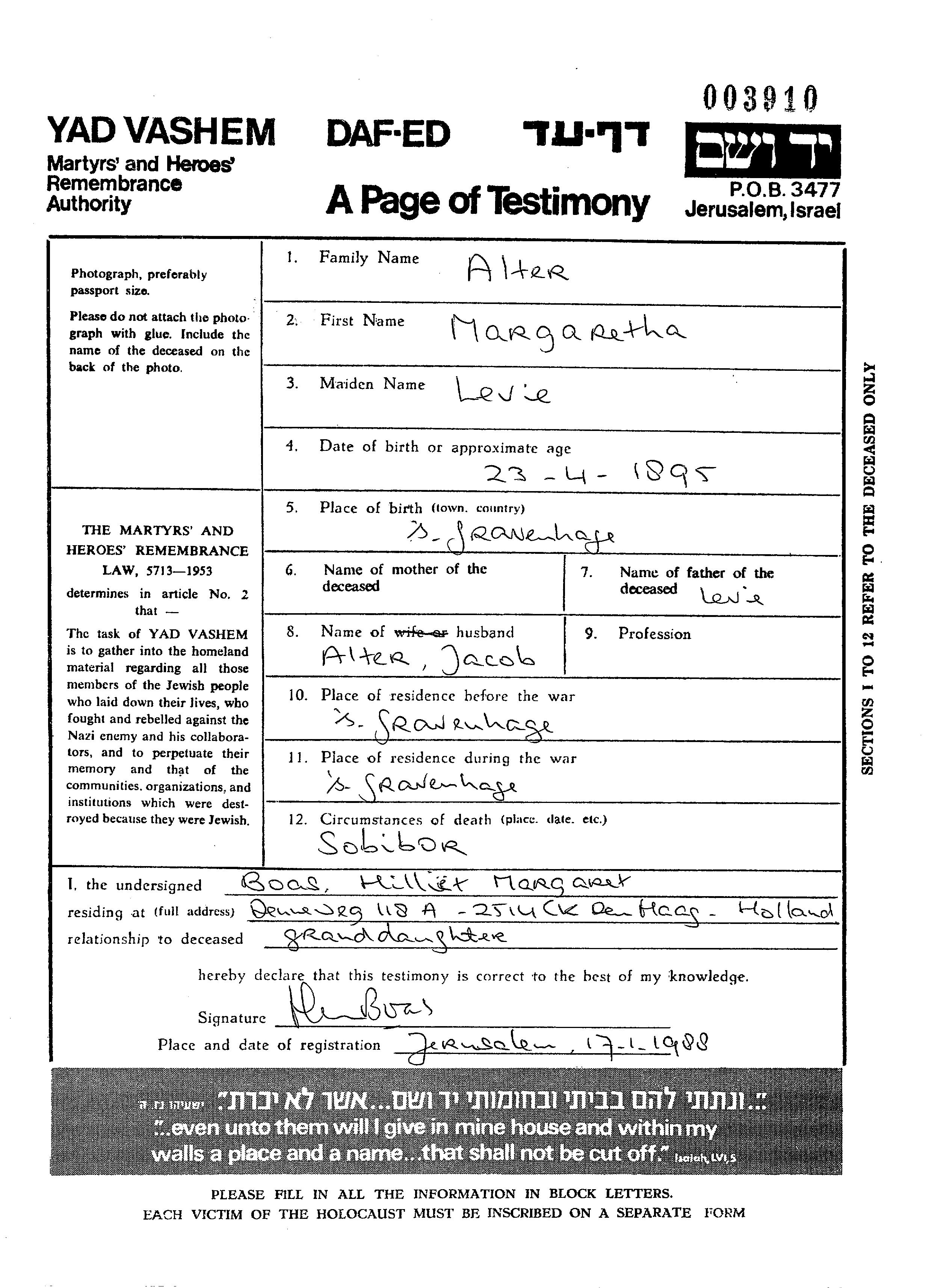 Margaretha Alter née Levie est née à S Gravenhage, Pays-Bas en 1895. Avant la seconde guerre mondiale elle vivait à S Gravenhage, Pays-Bas.