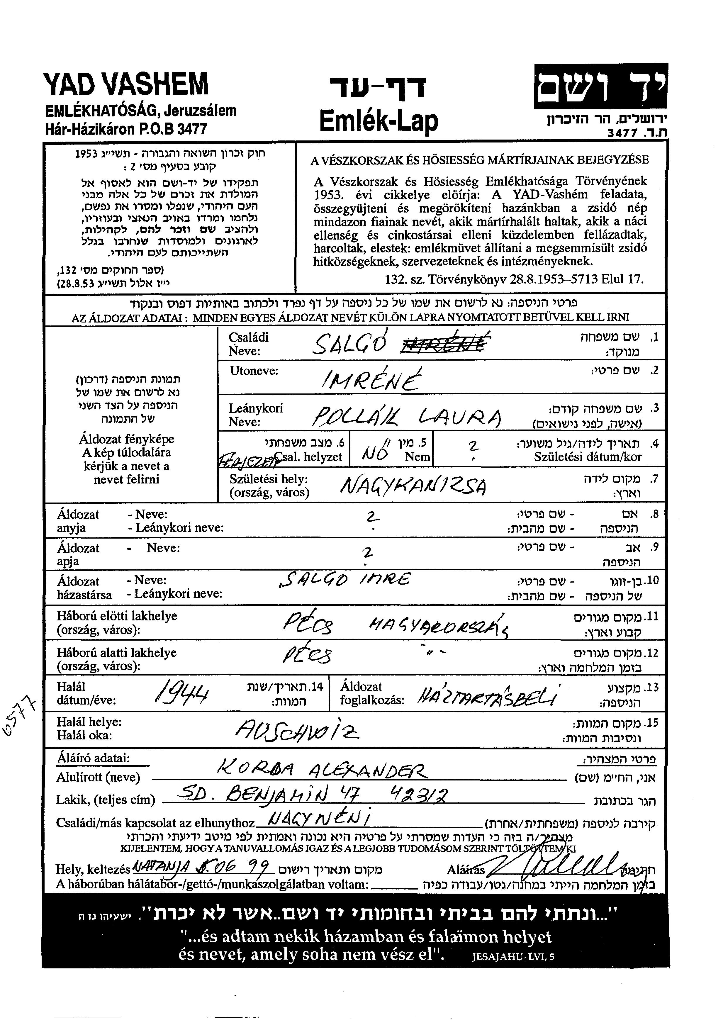 Salgo Laura Pecs, Hongrie Feuille de témoignage
