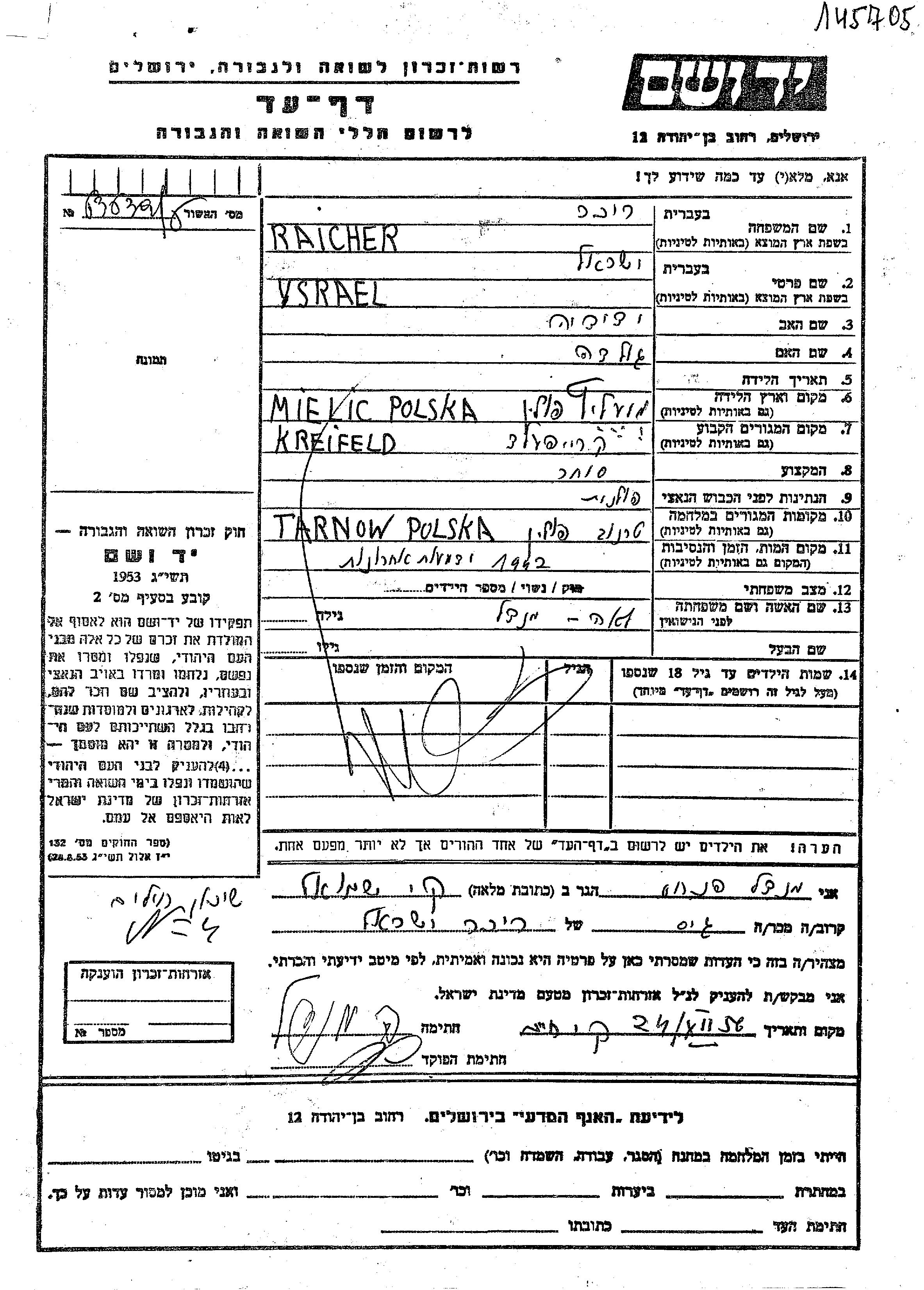 Raicher Rikher | Ysrael | Kreifeld, Allemagne | Feuille de témoignage | |