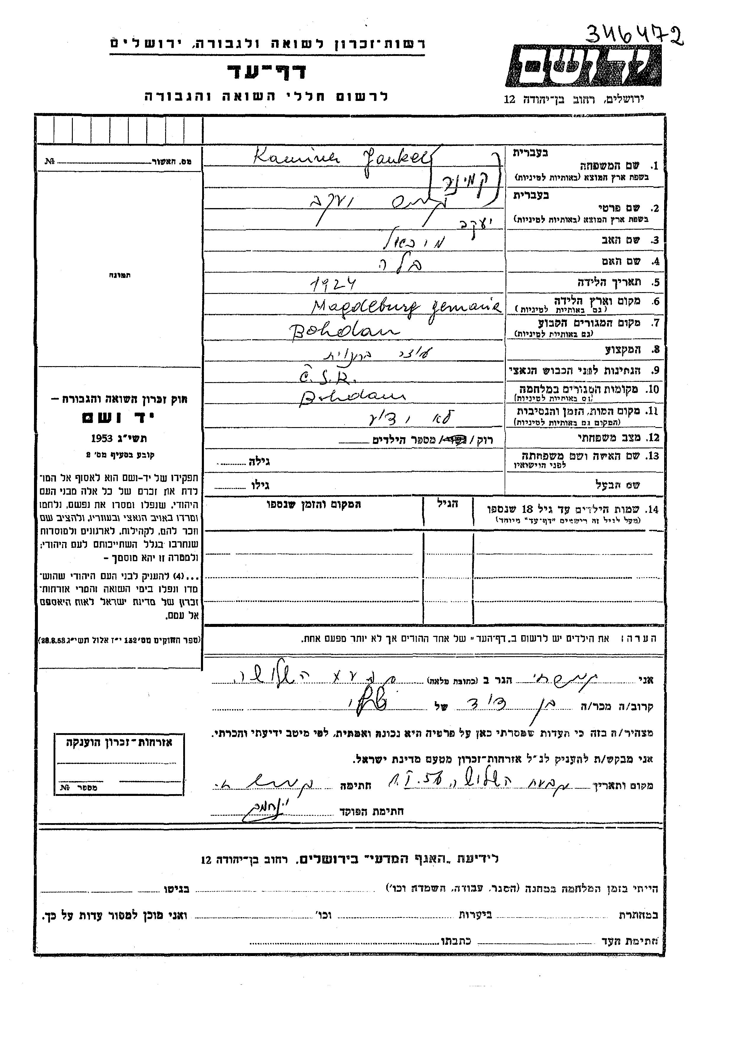 | Kaminer | Yaakov | 1924 | Bohdan, Tchécoslovaquie | Feuille de témoignage |