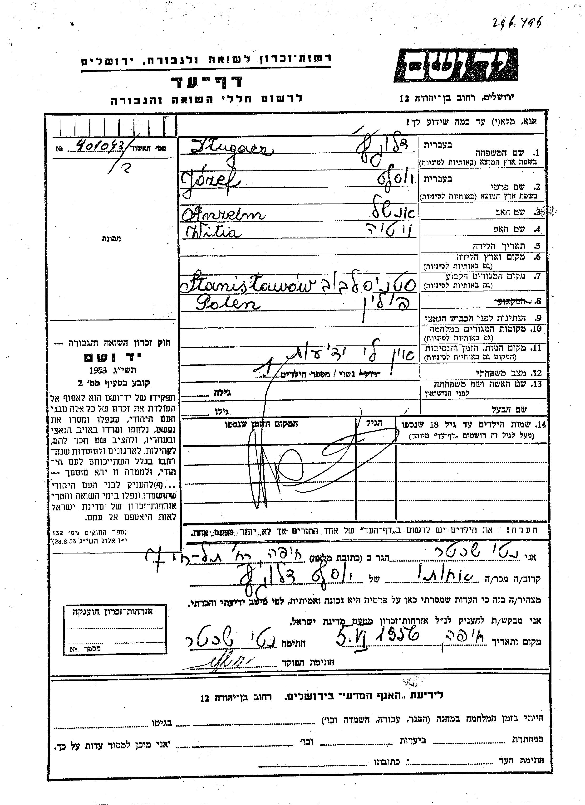 Dlugacz Yosef 1899 Stanislowow, Pologne Feuille de témoignage