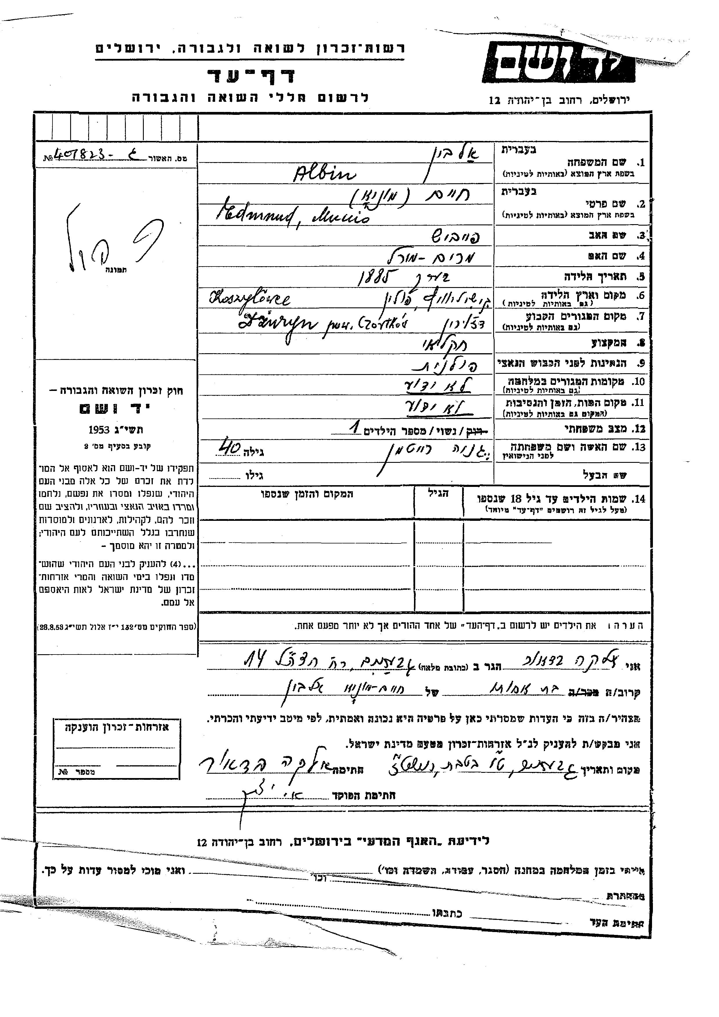 Yad Vashem - Pages of Testimony Names Memorial Collection