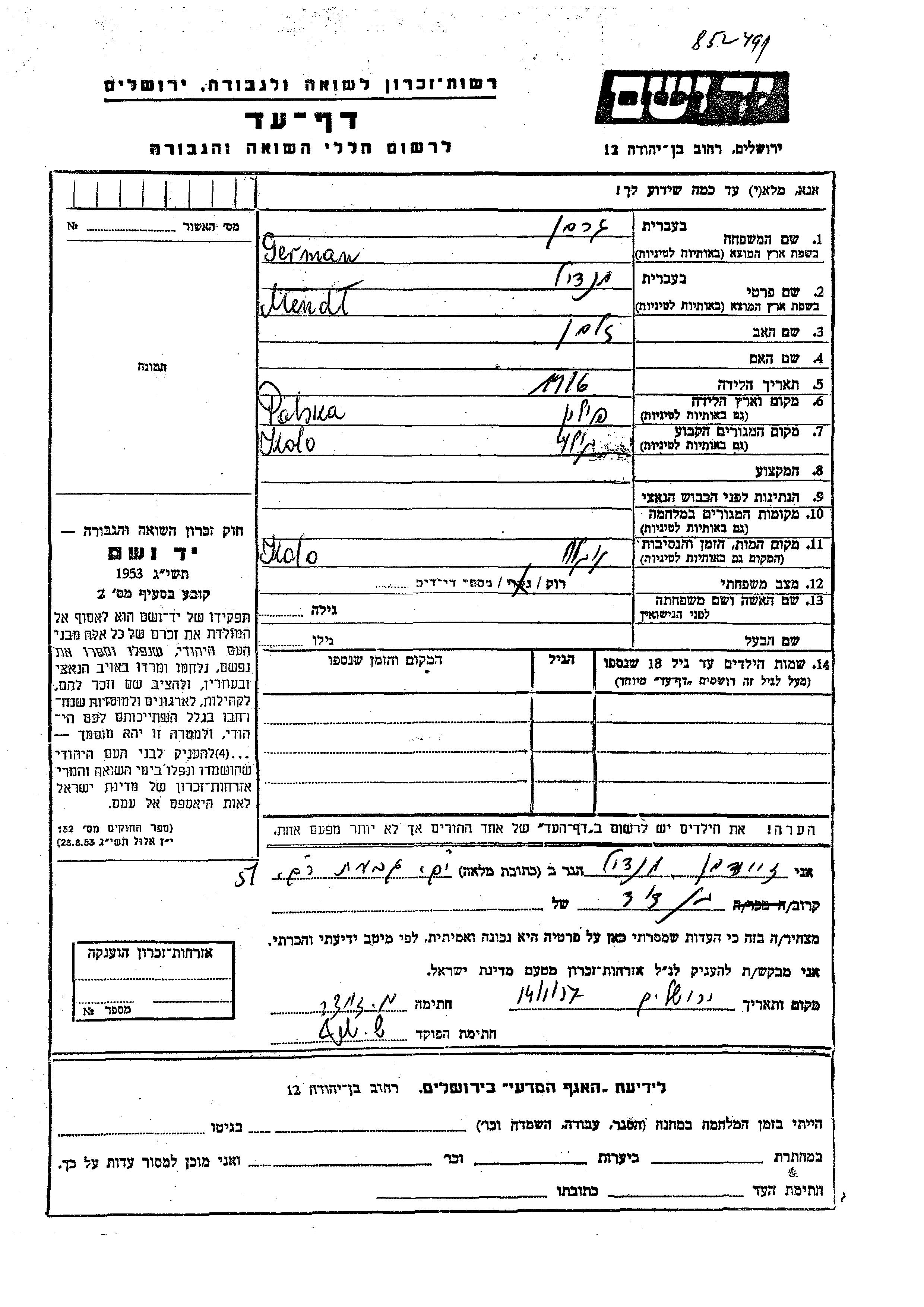 Menyn Mendl Germann est né à Kolo, Pologne en 1916. Il était Soldat. Avant la seconde guerre mondiale il vivait à Kolo, Pologne.