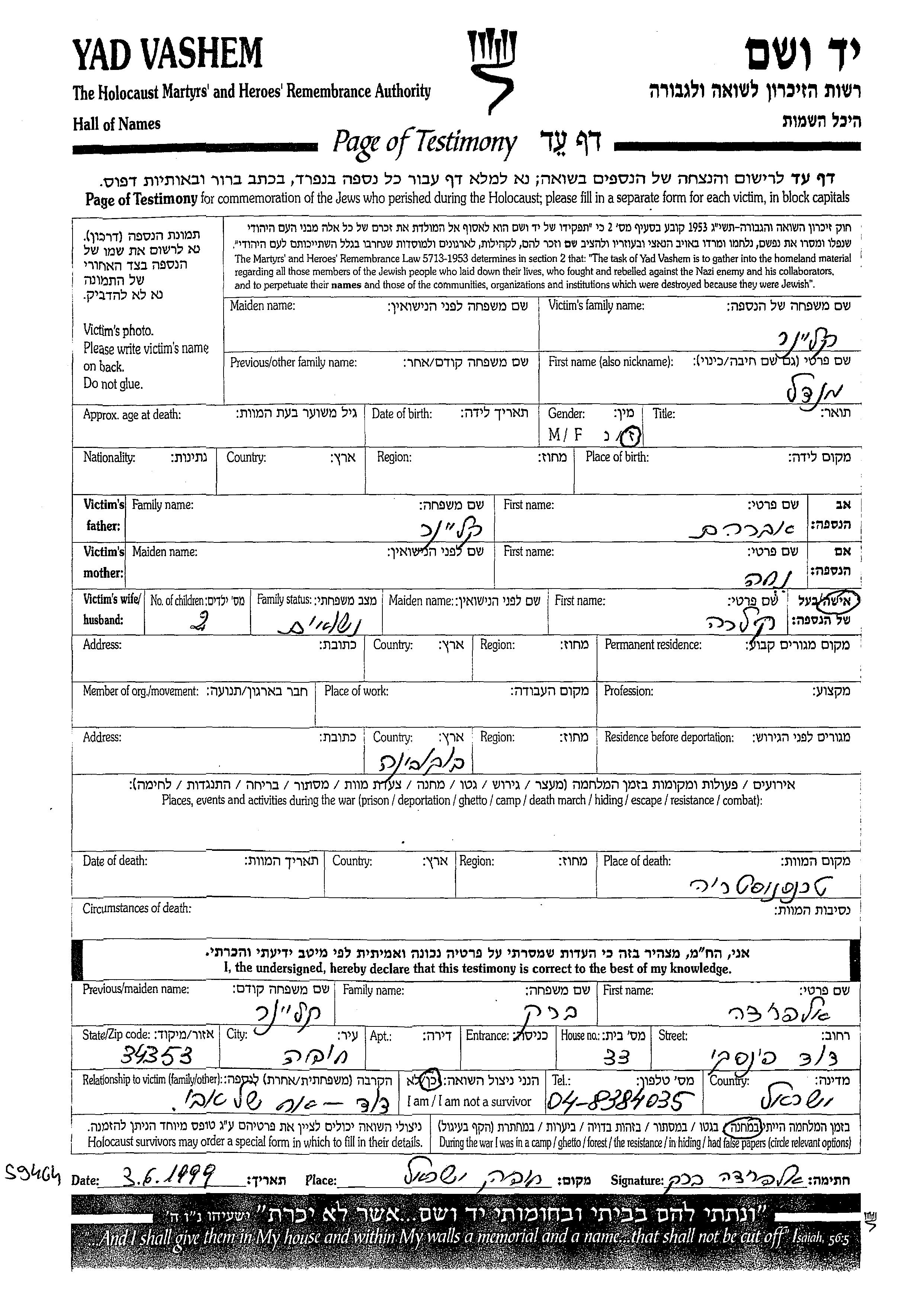 Kleiner | Mendel | endroit inconnu, | Feuille de témoignage | |