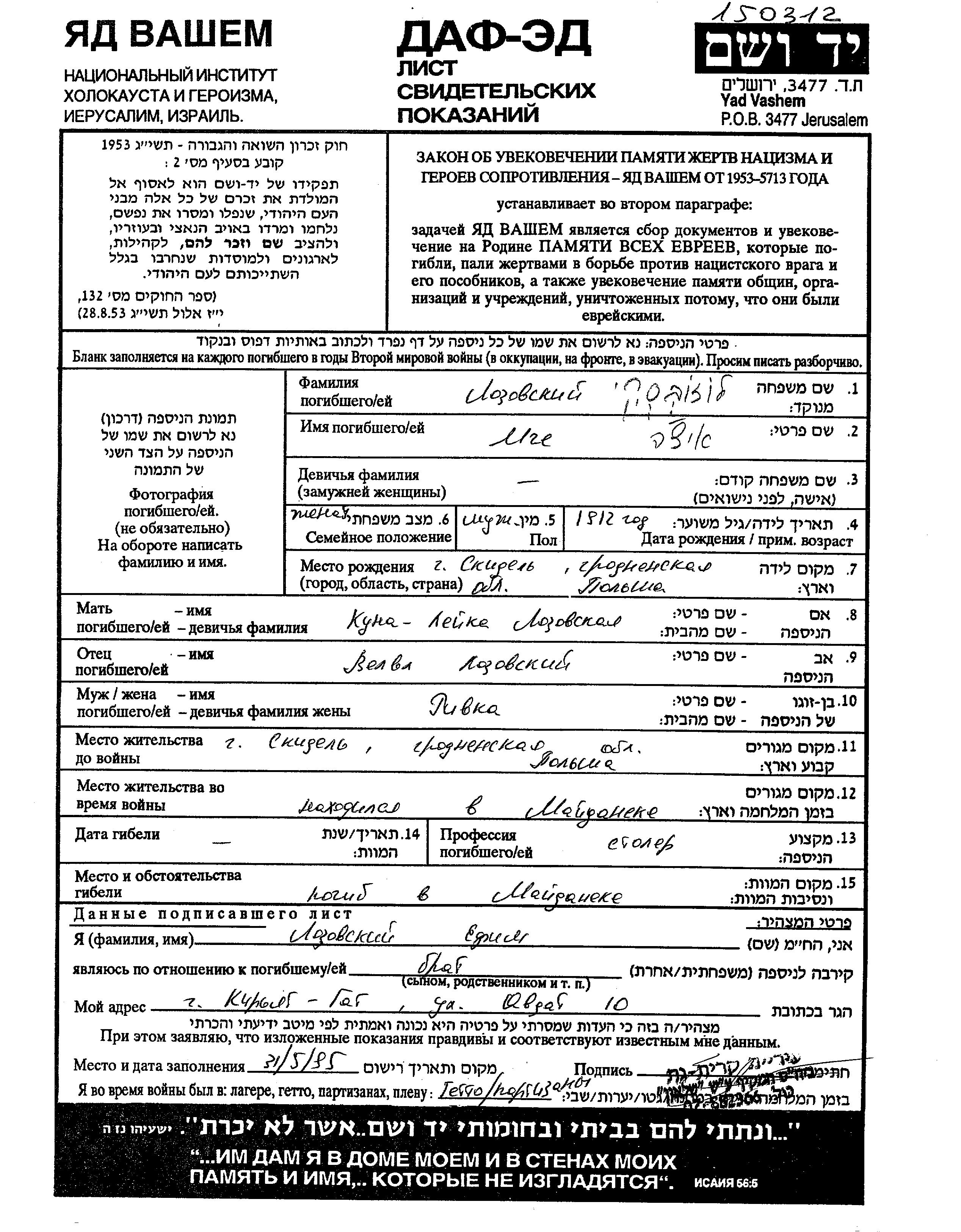 Iche Lozovski est né à Skidel, Pologne en 1912. Il était Charpentier. Avant la seconde guerre mondiale il vivait à Skidel, Pologne.
