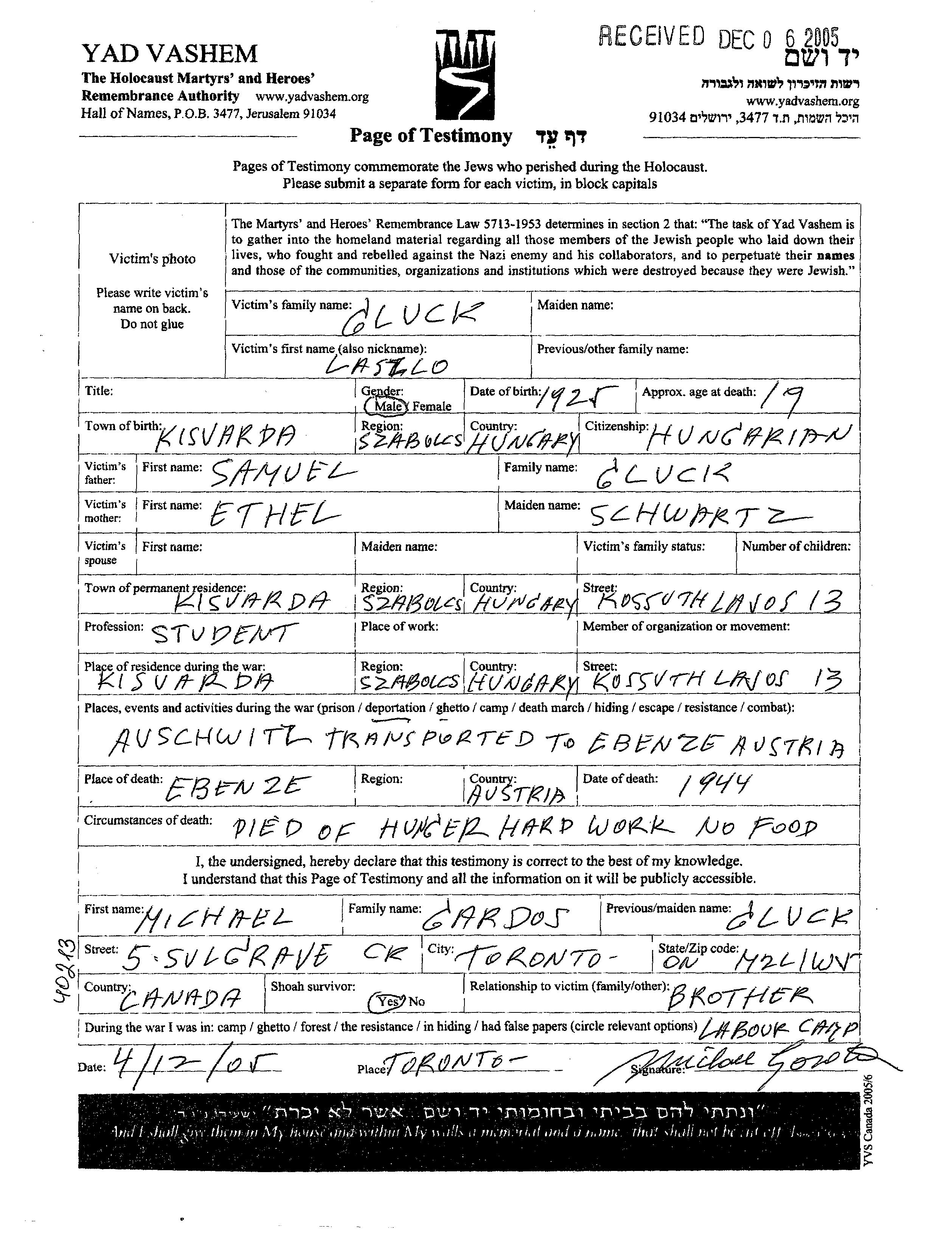 Laszlo a été assassiné pendant la Shoah. Lieu de la mort: Ebensee, Autriche en 1944.