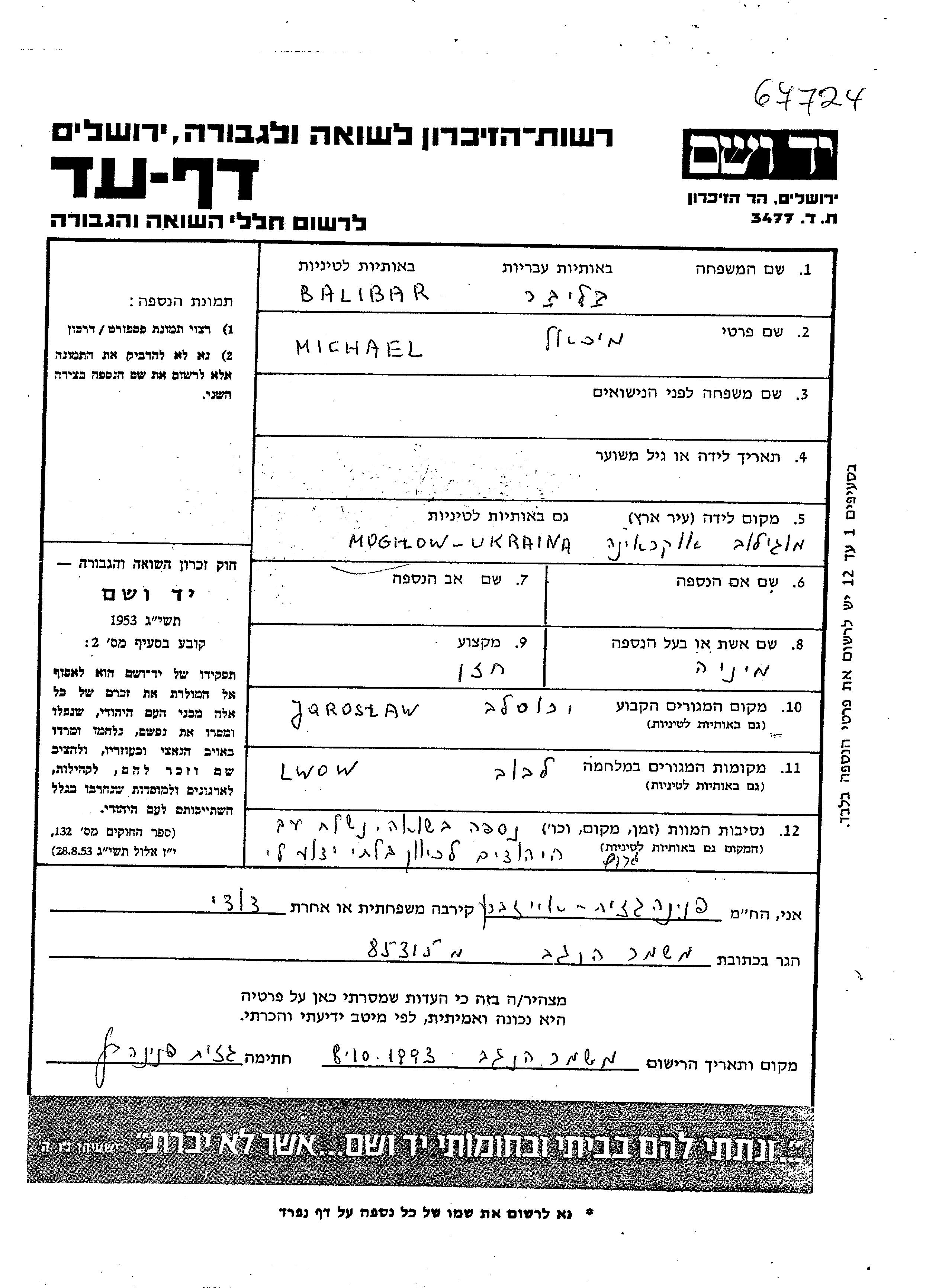 Balibar | Mikhael | Jaroslaw, Pologne | Feuille de témoignage |