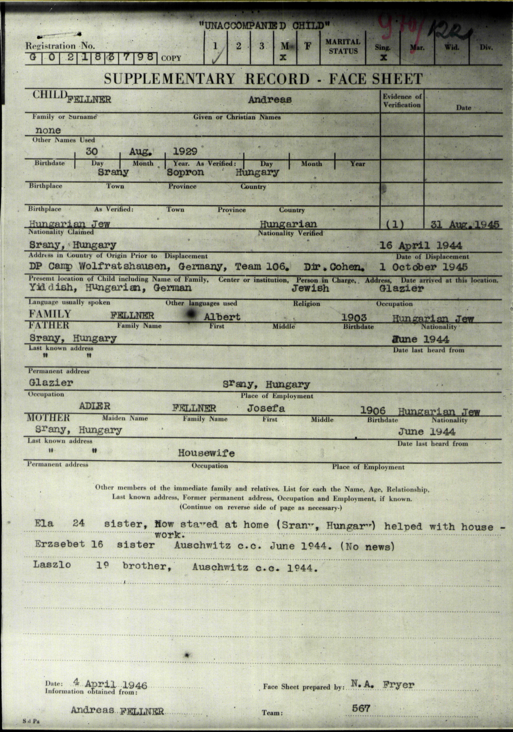 Lászó Fellner est né à Szany, Hongrie en 1927. Il était Ouvrier agricole. Avant la seconde guerre mondiale il vivait à Szany, Hongrie.