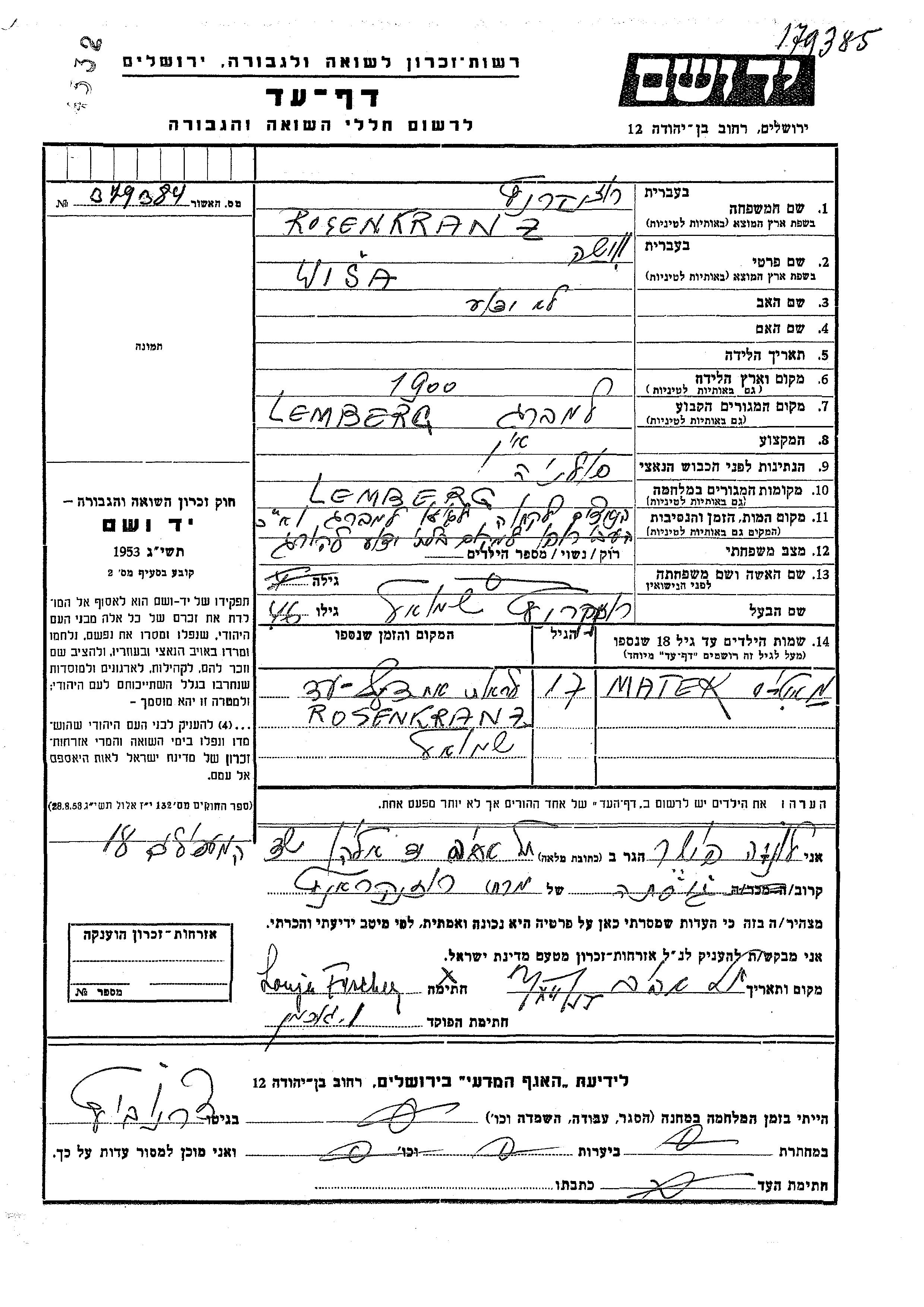 Wisa Visha Rosenkranz est née en 1900. Elle était Mariée à Shmuel. Avant la seconde guerre mondiale elle vivait à Lemberg, Pologne. Pendant la guerre, elle était à Lemberg, Pologne.