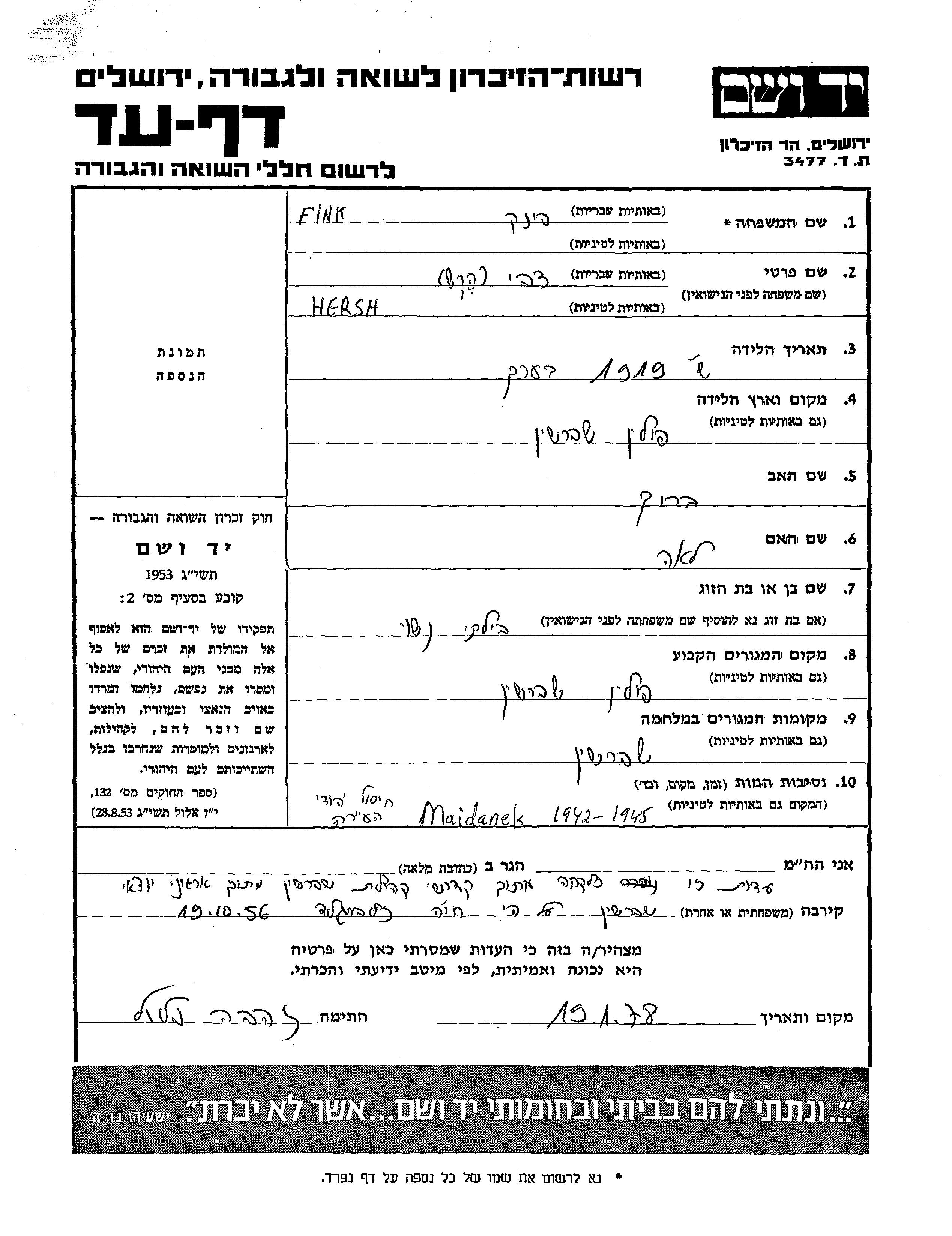 Fink Hersh Debi 1919 Szebrasin, Pologne Feuille de témoignage